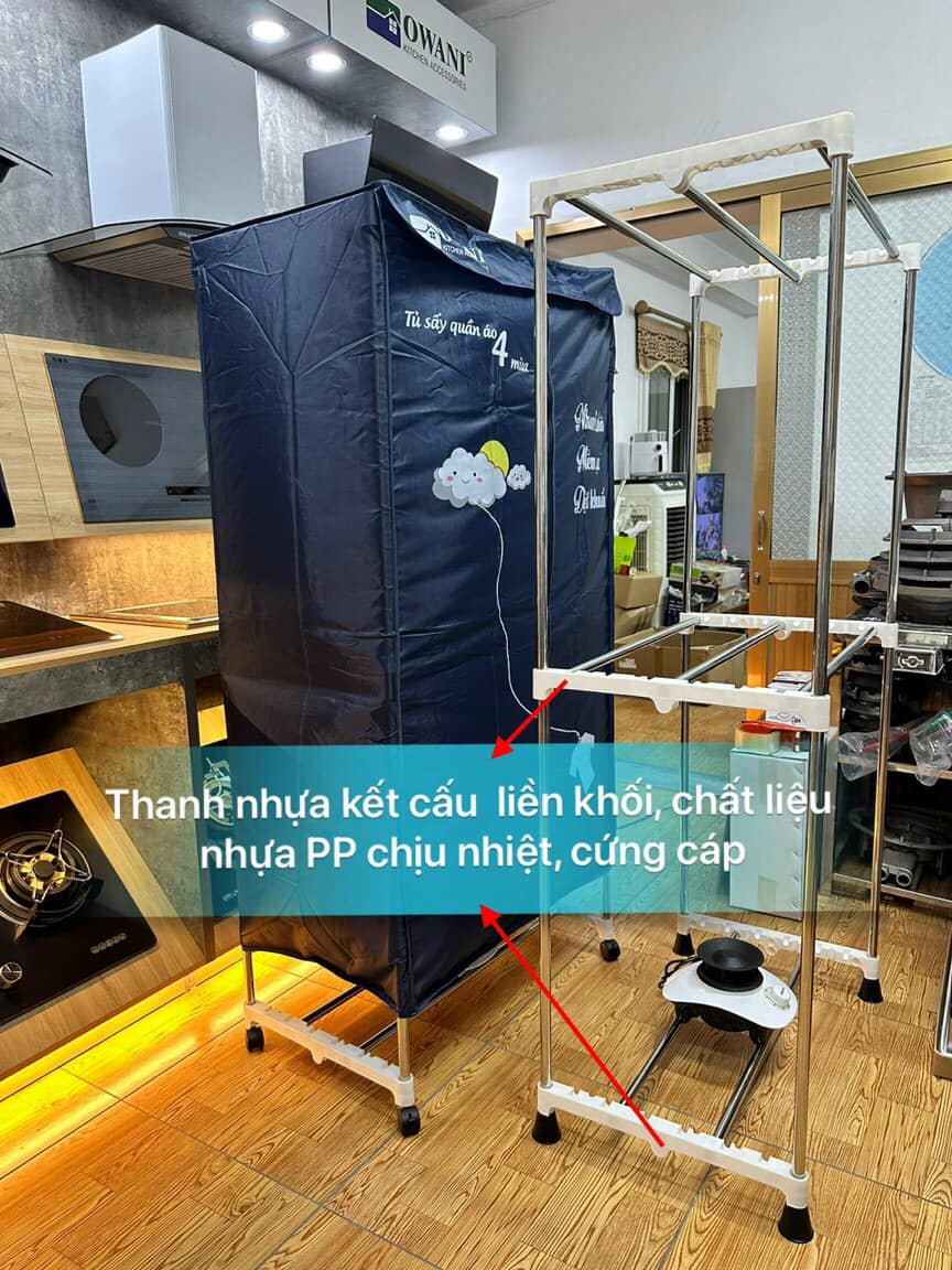 Tủ Sấy Quần Áo Bennix BN-115BIG -1800W Vài năm gần đây tủ sấy quần áo Thái Lan thương hiệu Bennix được nhiều gia đình lựa chọn. Sản phẩm có khung chắc chắn, vải bạt tốt, động cơ sấy an toàn, vải bạt bên ngoài không bị vỡ giòn hay rách mủn sau một thời gian sử dụng như loại rẻ tiền đang bán trên thị trường. Mặc dù giá cao hơn một chút so với máy sấy quần áo giá rẻ nhưng lợi ích mang lại lâu dài và yên tâm sử dụng. Khung Inox to Điểm khác biệt lớn nhất của tủ sấy quần áo Thái Lan Bennix BN-115BIG mẫu mới là khung inox cao hơn. Chiều cao sau lắp đặt khoảng 172cm, trong khi các loại đang bán trên thị trường khoảng 150cm. Chiều rộng của tủ 90cm (loại cũ chỉ 70cm). Nhờ đó bạn treo được nhiều đồ hơn. Với các mẫu máy sấy quần áo hiện nay thường sấy khoảng 15kg nhưng Bennix BN-115BIG có thể sấy tối đa 25kg. Các thanh inox cũng to hơn, khi lắp đặt bạn sẽ có cảm giác chắc chắn hơn rất nhiều so với các loại. Khả năng chịu lực tốt. Chất liệu inox không gỉ. Ngoài các thanh chính còn có thêm các thanh phụ nhỏ giúp tăng khả năng tận dụng tối đa bên trong buồng sấy. Khả năng cơ động cao với bánh xe di chuyển. Thiết kế thông minh dễ dàng tháo lắp khi có nhu cầu hoặc không muốn sử dụng khi hết mua. Khung tủ chắc chắn bạn cũng có thể sử dụng thay cho tủ vải đựng quần áo. Vải cao cấp Vải bạt phủ bên ngoài thủ sấy cũng có sự khác biệt đáng kể. Thay vì sử dụng chất liệu pha nhiều, tủ sấy quần áo Bennix BN-115BIG sử dụng loại vải cao cấp. Nhờ đó độ bền tăng lên rấ nhiều. Sản phẩm không bị mục, rách, thoái hóa sau một thời gian sử dụng. Công suất lớn Động cơ của tủ sấy quần áo Bennix BN-115BIG cũng có sự khác biệt rất lớn. Công suất lớn, chất liệu nhự cao cấp và bộ phát nhiệt ổn định giúp duy trì nhiệt độ bên trong buồng sấy tối ưu. Máy sẽ tự động ngắt sau khi hết thời gian để đảm bảo an toàn. Sấy khô nhanh, bảo vệ quần áo Công suất của động cơ tối đa 1800w, nhờ đó máy có thể sấy lượng lớn quần áo nhanh chóng. Thời gian sấy có thể lựa chọn tối đa 3 giờ. Tùy theo lượng quần áo, chấ liệu vải dầy hay mọng bạn có thể chọn lựa thời gian phù hợp. Hệ thống sấy khô kết hợp diệt sạch vi khuẩn và chống nhăn giúp bảo vệ quần áo. Hướng dẫn sử dụng tủ sấy Bennix BN-115BIG Trước tiên bạn cần lắp ráp tủ sấy trước khi sử dụng. Tham khảo qua sách hướng dẫn lắp đặt