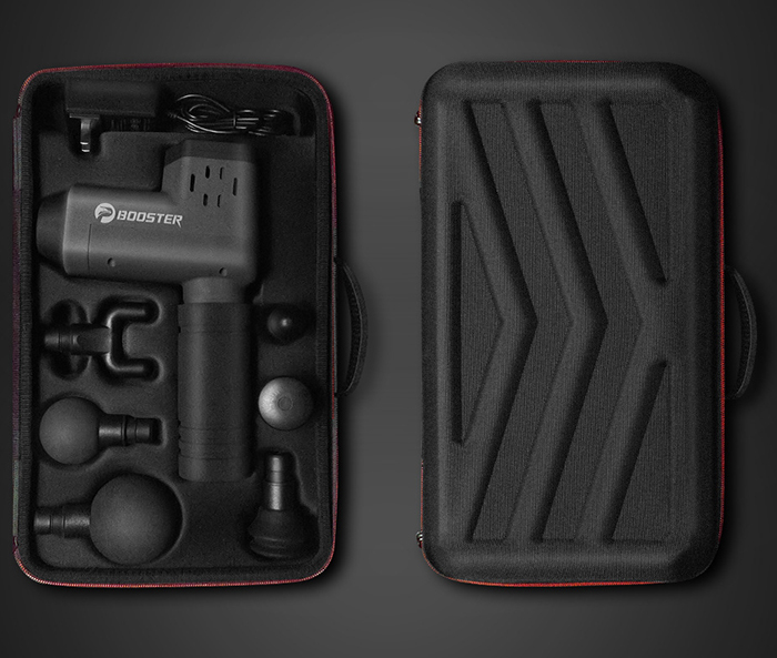 Máy massage cầm tay tạo cơ bắp Booster T được trang bị vali đựng sản phẩm và phụ kiện gọn gàng. Nhờ đó mà bạn có thể mang theo bộ sản phẩm một cách dễ dàng tiện lợi