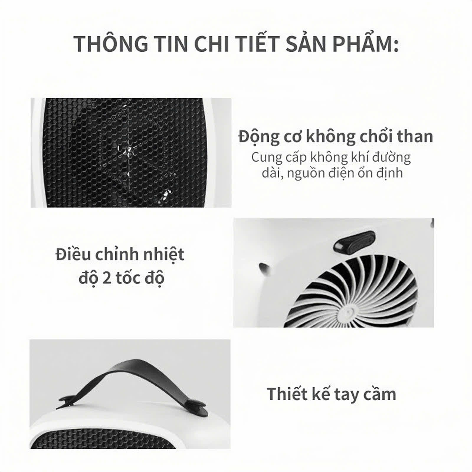 - Quạt sưởi mini nhỏ gọn có thể để trên bàn làm việc, bàn học rất tiện. THÔNG TIN SẢN PHẨM: