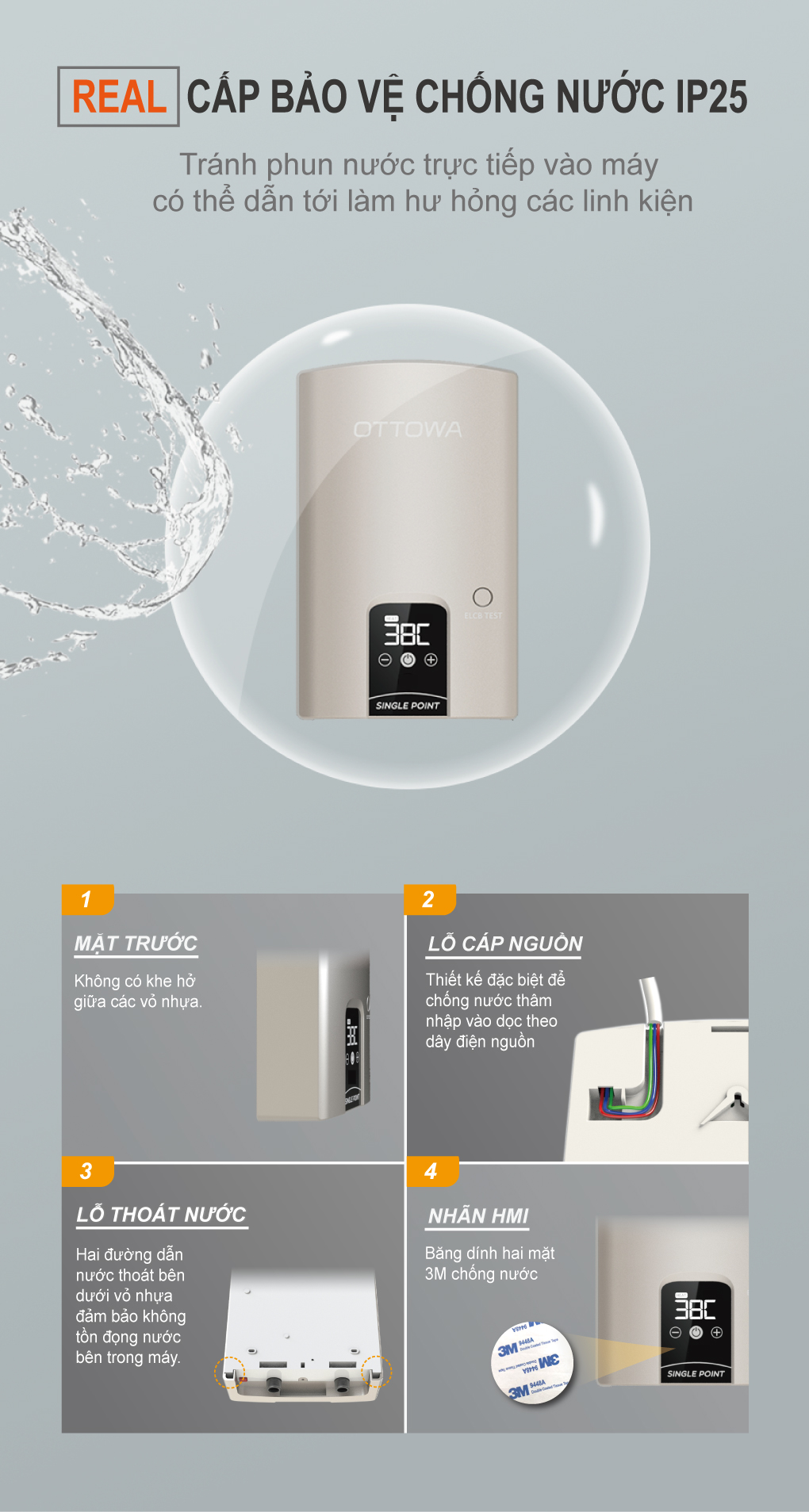 Sản phẩm cơ siêu bền và không bị ảnh hưởng độ ẩm cao trong nhà tắm. Được trang bị chống giật RCD an toàn tuyệt đối: được chứng nhận bởi TUV Rheinland và CQC Bầu