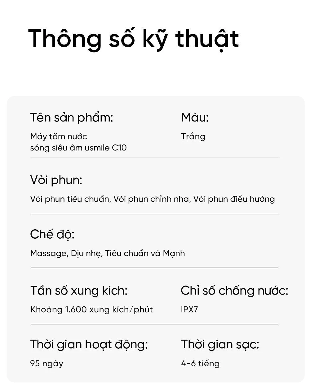 Với usmile C10, bạn không chỉ có được sự sạch sẽ và sức khỏe cho răng miệng mà còn trải nghiệm sự tiện lợi và thoải mái từ việc chăm sóc răng miệng hàng ngày.