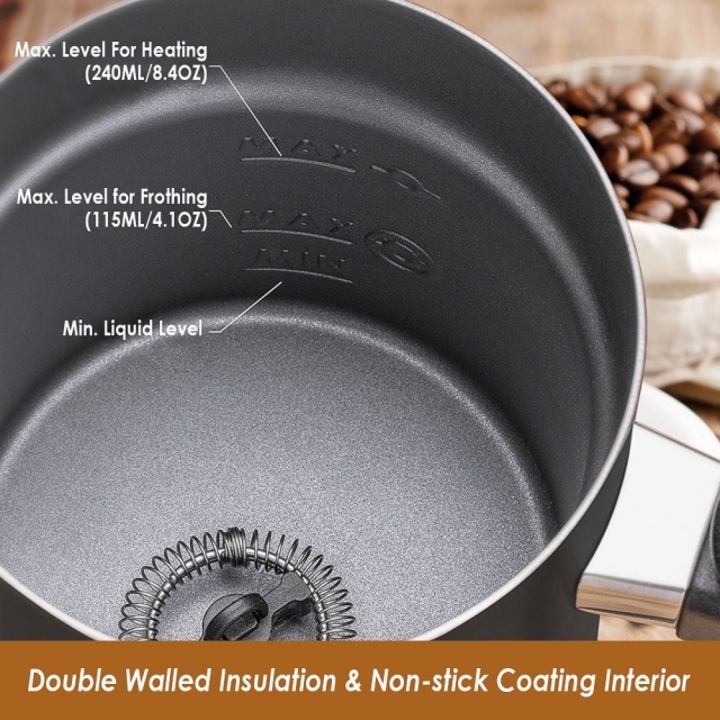 - Máy tạo bọt sữa được làm bằng inox cao cấp 304, dày dặn; siêu bền bỉ và hoàn toàn chống han gỉ. Bề mặt inox được phủ thêm lớp chống dính giúp bạn dễ dàng vệ sinh. Thanh khuấy inox siêu bền