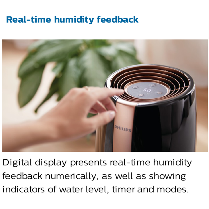 - Những hạt nước với kích cỡ nano nhờ công nghệ xông hơi NanoCloud sẽ giúp giảm đi 99% vi khuẩn trong phòng. -️ Máy làm ẩm của Philips cho phép bạn lựa chọn độ ẩm từ 40, 50 và 60% cho sự thoải mái tối đa. - Đèn báo màu đỏ cho bạn biết bồn chứa nước cần được làm đầy. -️ Khi bồn chứa nước cạn, máy sẽ tự động tắt. -️ Có 3 chế độ lựa chọn tốc độ làm ẩm: Thấp, bình thường và nhanh. Thông số kỹ thuật: