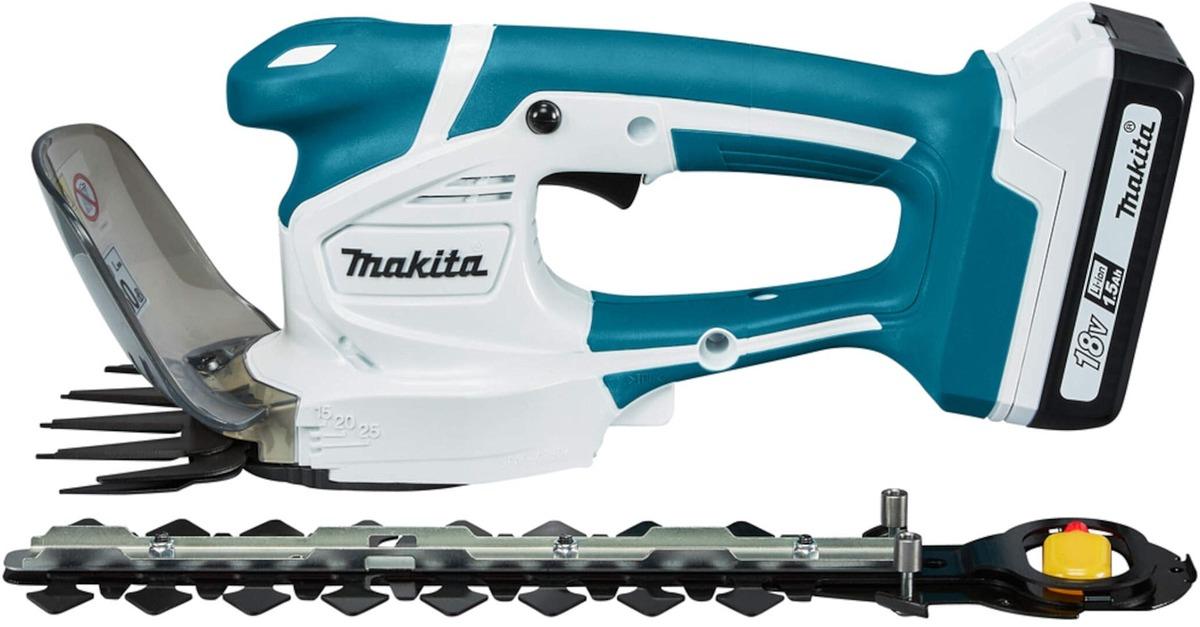 Trong hộp có: Máy tỉa hàng rào Makita UM110DWYX, Lưỡi tỉa hàng rào, Bảo vệ lưỡi, Vỏ bảo vệ lưỡi, 1 pin 1.5Ah BL1815G, 1 sạc