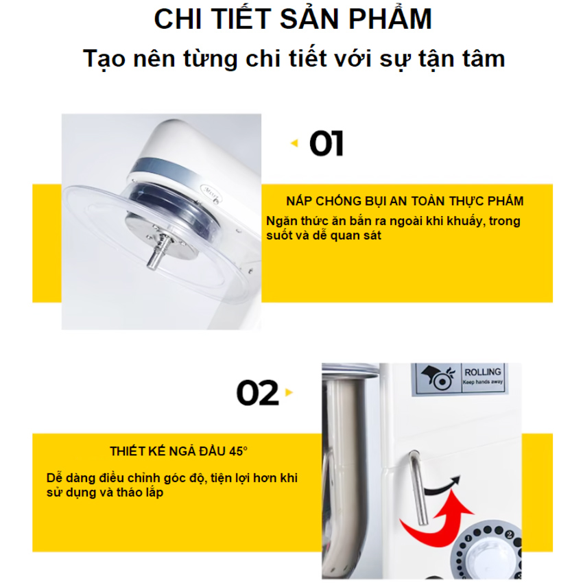 Động cơ cực mạnh cho nhu cầu chế biến cao Nhờ động cơ cực mạnh, bạn có thể dễ dàng thực hiện mọi ý tưởng làm bánh và nấu nướng của mình. Chiếc máy Trộn