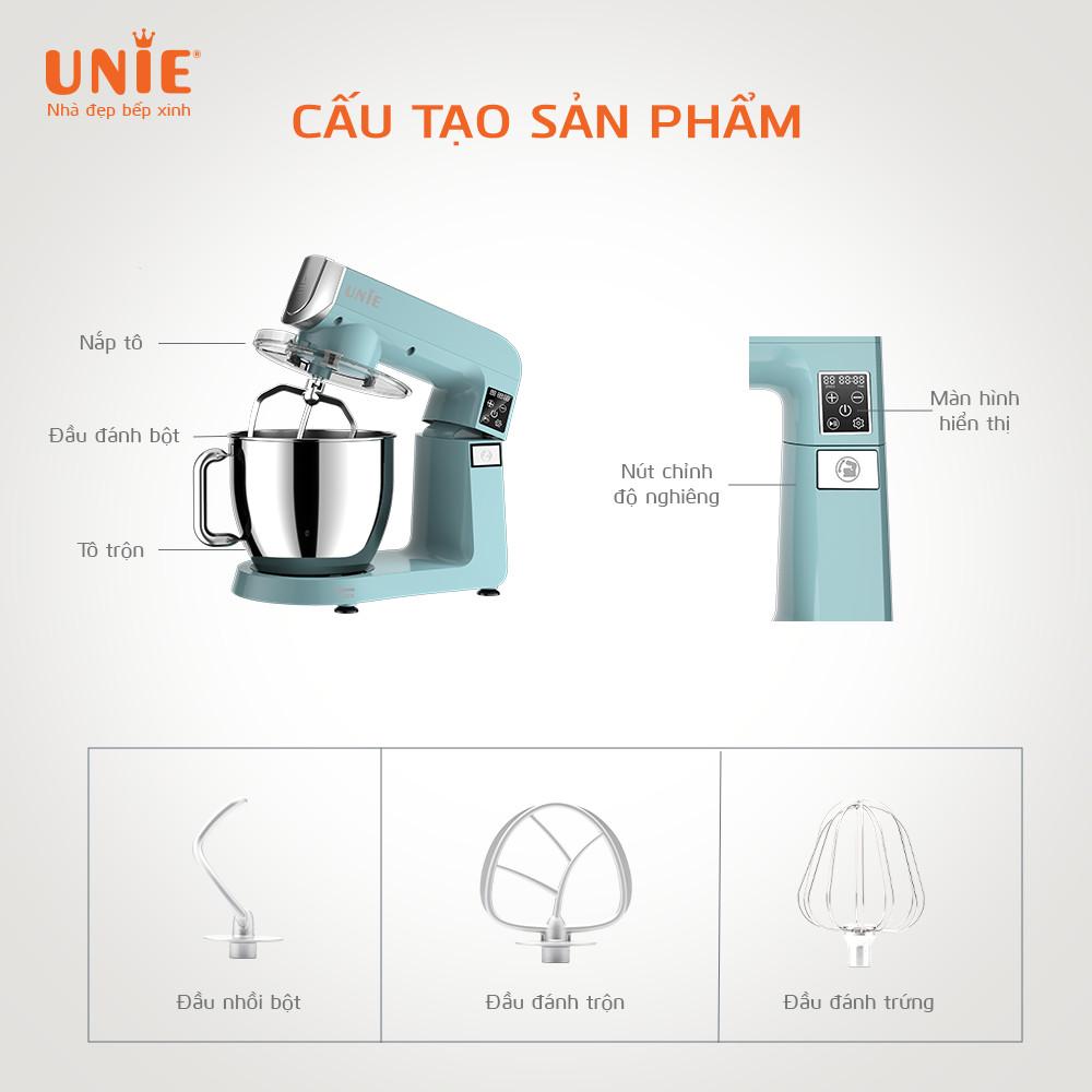 Mua tại TiktokMáy nhồi bột đa năng UNIE UE-990 có các chức năng: nhồi bột, trộn thực phẩm, đánh trứng, đánh kem. UE-990 có 10 nấc tốc độ có thể điều chỉnh tốc độ theo yêu cầu, giúp thực phẩm đạt được chất lượng tốt hơn. Trang bị 3 bộ phụ kiện chính được làm bằng hợp kim kẽm không gỉ: Đầu nhồi bột, đầu đánh trộn và đầu đánh trứng. Ngoài ra, UNIE UE-990 dung tích lớn 6.5L thoải mái trộn lượng bột lớn phù hợp với những chị em đam mê làm bánh. ƯU ĐIỂM NỔI BẬT CỦA MÁY NHỔI BỘT UNIE UE-990 Công suất lớn 1800W cho thành phẩm bột mịn hơn Unie UE-990 sở hữu công suất 1800W giúp máy hoạt động mạnh mẽ, bền bỉ. Trộn được nhiều bột hơn, thành phẩm bột mịn mướt hỗ trợ bạn làm nên những mẻ bánh ngon nhất. Dung tích thố trộn 6.5L kết hợp với nắp chống văng thông minh Với dung tích thố trộn 6.5L bạn có thể đánh được 1000g bột khô thêm 538g nước trong 1 lần đánh. Thố trộn làm bằng chất liệu inox 304 sáng bóng, chống han gỉ rất an toàn. Ngoài ra, máy có thiết kế phần nắp chống văng thông minh nên bạn yên tâm là bột sẽ luôn nằm gọn trong thố không bị bắn ra ngoài trong quá trình đánh trộn. Chất liệu thân kim loại nguyên khối bền bỉ kết hợp lớp vỏ sơn tĩnh điện màu xanh pastel hiện đại, trẻ trung Phần thân máy sử dụng thân kim loại nguyên khối giúp tăng trải nghiệm người dùng. Ngoại hình UE-990 nhìn khỏe khoắn hơn và độ bền cao không lo tình trạng hoen gỉ khi sử dụng máy trong thời gian dài. Lớp vỏ được sơn tĩnh điện màu xanh pastel đậm chất vintage sẽ phù hợp với những bạn thích thiết bị nhà bếp vừa tiện dụng vừa là vật decor cho căn bếp thêm ấm cúng. Phụ kiện đa dạng, gồm 3 đầu đánh sử dụng linh hoạt Máy nhồi bột thế hệ mới Unie UE-990 có 3 đầu trộn linh hoạt dễ dàng tháo lắp và sử dụng gồm: đầu nhồi bột, đầu đánh trộn và đầu đánh trứng. 3 đầu phụ kiện đều được làm chất liệu an toàn, chống han gỉ nên bạn yên tâm sử dụng. Màn hình LED hiển thị rõ ràng, cài đặt điều chỉnh thời gian linh hoạt Ngoài yếu tố ngoại hình băt mắt, Máy nhồi bột Unie UE-990 sở hữu bảng điều khiển cảm ứng hiện đại hiện thị thời gian, tốc độ đánh và tùy chỉnh cài đặt thời gian theo ý giúp hỗ trợ bạn tối đa trong quá trình làm bánh. Màn hình LED hiện thị các thông số thời gian, tốc độc to rõ ràng dễ quan sát. Chân đế cao su chắc chắn Thiết kế phân chân mút cao su giúp khi máy hoạt động ở công suất lớn nhất vẫn có thể bám chắc vào mặt bàn phẳng tăng tuổi thọ cho máy và tính an toàn của sản phẩm Vệ sinh dễ dàng Với vỏ ngoài được phủ sơn tĩnh điện và toàn bộ phụ kiện được làm bằng inox 304 sáng bóng, phụ kiện tháo dời linh hoạt nên việc vệ sinh máy rất dễ dàng. Với phụ kiện bạn làm sạch bằng dung dịch tẩy rửa thông thường. Với thân máy dùng khăn mềm lau sạch là được. Lưu ý không nhúng phần thân máy vào nước sẽ ảnh hưởng tới phần động cơ bên trong. THÔNG SỐ KỸ THUẬT TỔNG QUAN VỀ MÁY NHỒI BỘT UNIE UE-990 Máy nhồi bột đa năng là gì? Máy nhồi bột hay còn được gọi là máy đánh bột, máy trộn bột. Trước kia nếu muốn làm bánh, bạn phải tự tay nhào bột còn giờ đây sử dụng máy nhồi bột gia đình hay máy nhồi bột công nghiệp. Tại sao nên mua máy nhồi bột đa năng Với nhiều người thì máy nhồi bột còn khá là mới mẻ nên họ cũng có những băn khoăn không biết loại máy này có tốt không, nhồi bột có đều không? Vậy chúng ta hãy cùng xem những lý do để bạn chọn máy nhồi bột làm bánh nhé: