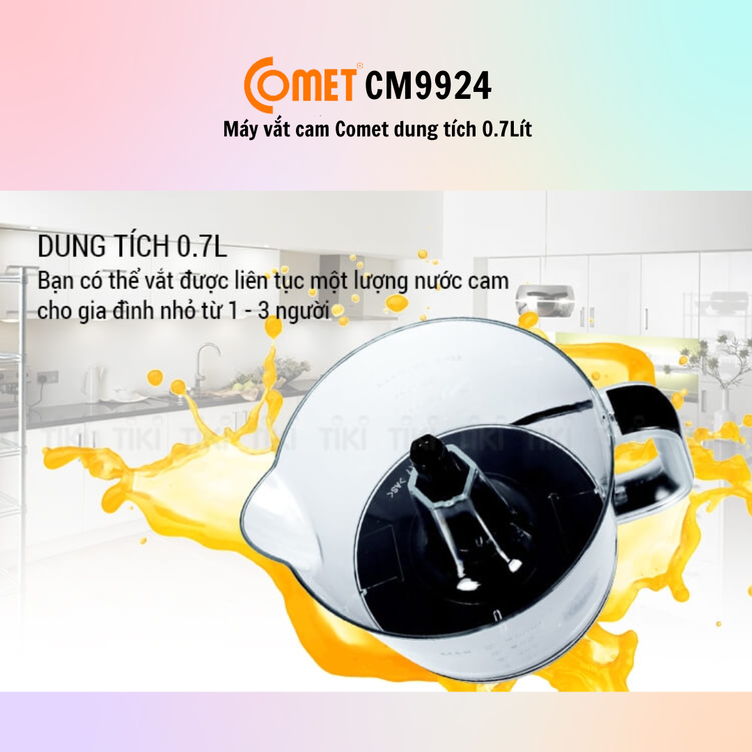 Máy vắt cam Comet CM9924 dung tích 0.7Lít - Hàng Chính Hãng THÔNG TIN KỸ THUẬT Thương hiệu Comet Sản phẩm Máy vắt cam Mã sản phẩm CM9924 Điện áp 220V - 50Hz Công suất 40W Dung tích 0.7L Kích thước 160*150*200 mm Cân nặng 0.82Kg Công dụng vắt, ép nước Xuất xứ Trung Quốc MÔ TẢ - Máy vắt cam Comet CM9924 thiết kế tiện lợi, dễ sử dụng và nhưng không kém phần sang trọng, được chế tạo bằng loại nhựa AS trong suốt cao cấp an toàn khi tiếp xúc với thực phẩm, giúp bạn dễ dàng quan sát lượng nước trái cây bên trong khi đang vắt hoặc khi sử dụng. - Với dung tích 0.7L, bạn có thể vắt được liên tục một lượng nước cam cho gia đình nhỏ từ 1 - 3 người sử dụng mà không cần lo hết chỗ chứa khi đang vắt, gây phiền phức và gián đoạn. - Máy vắt cam Comet CM9924 hỗ trợ đầu vắt xoay 02 chiều, cho phép bạn vắt nước cam được thuận tiện và không gây cháy mô tơ. Ngoài ra, máy còn hỗ trợ khay lọc hạt hiệu quả, cho bạn một lý nước trái cây thơm ngon nhất mà không lo bị nuốt phải hạt khi đang uống. - Các bộ phận của Máy vắt cam Comet CM9924 có thể tháo lắp một cách dễ dàng, giúp bạn có thể nhanh chóng vệ sinh sạch sẽ sau khi sử dụng xong. - Máy vắt cam Comet CM9924 được hỗ trợ một nắp đậy với thiết kế vừa vặn, giúp bạn bảo vệ các bộ phận bên trong tránh khỏi bụi bẩn nếu không sử dụng trong thời gian dài. - Máy vắt cam Comet CM9924 có công suất 40W cùng tính năng tự động đảo chiều giúp bạn dễ dàng vắt trái cây tươi lấy nước nhanh chóng, tiết kiệm điện