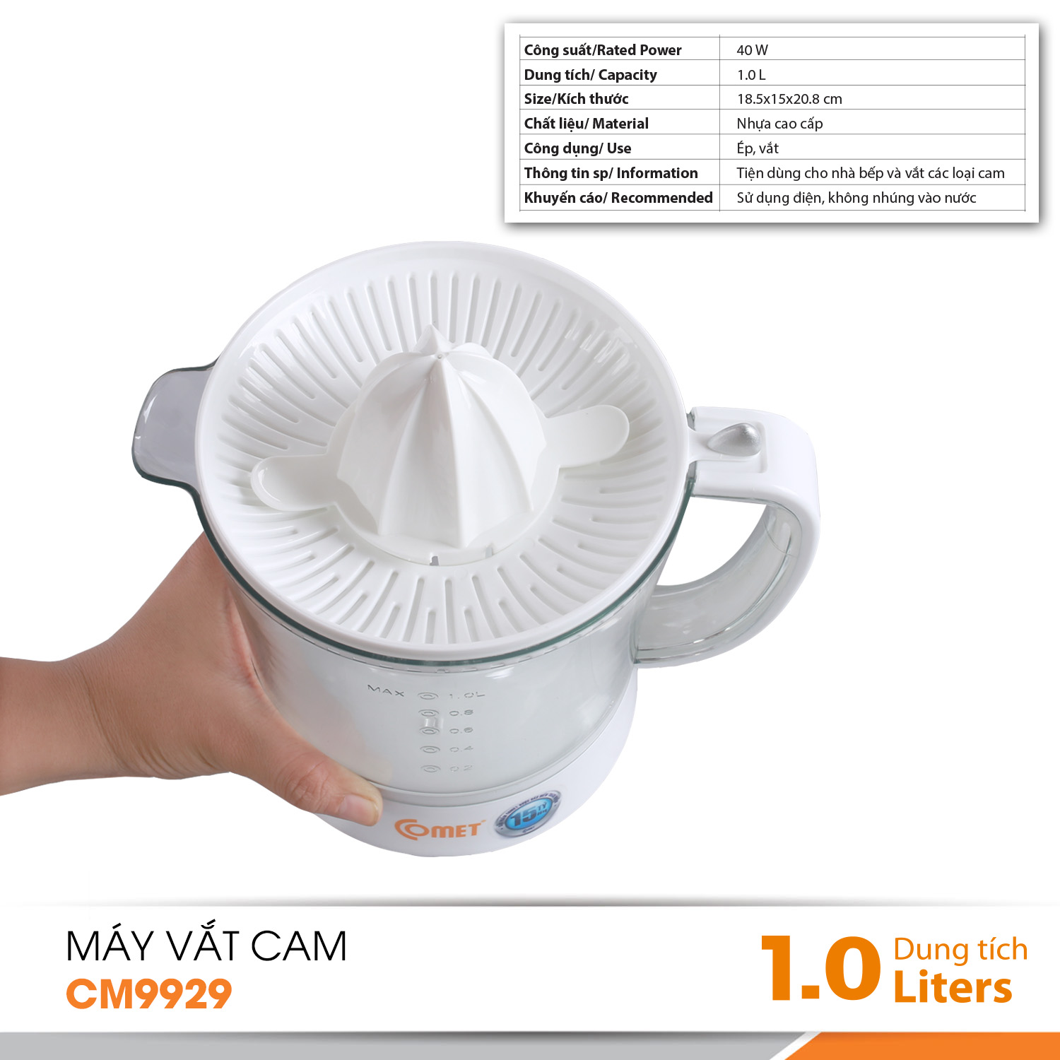 Mua tại TiktokTHÔNG TIN KỸ THUẬT: 1.Thương hiệu : Comet 2.Sản phẩm : Máy vắt cam 3.Mã sản phẩm : CM9929 4.Điện áp : 220V - 50Hz 5.Công suất: 40W 6.Dung tích: 1000ml 7.Kích thước : 185150208 mm – cân nặng : 0.5 kg 8.Xuất xứ : Trung Quốc. MÔ TẢ :