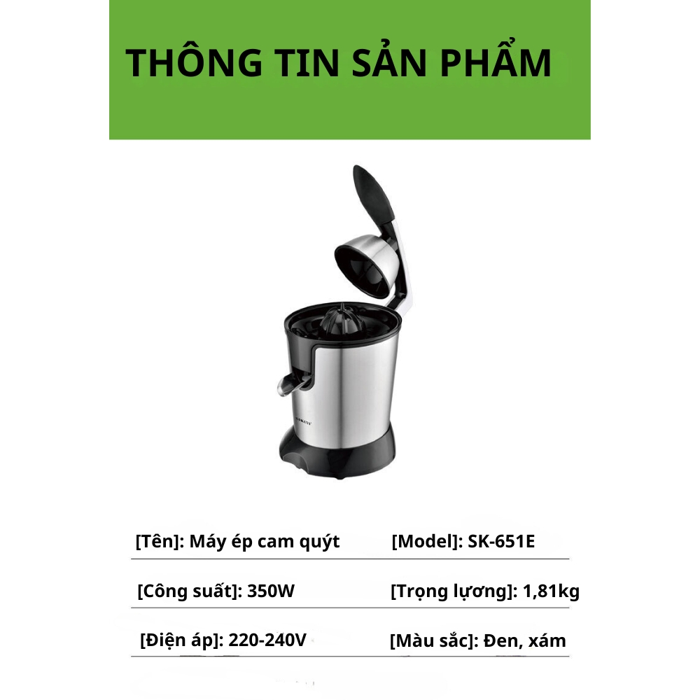 - Điện áp: 220V 2.TÍNH NĂNG NỔI BẬT CỦA MÁY VẮT CAM SOKANY SK-651E: