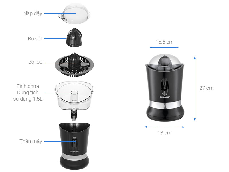 Máy vắt cam Sharp thiết kế gọn nhẹ, màu trắng sáng tươi trẻ, có tay cầm chắc chắn Chuyên dụng để vắt các loại hoa quả họ cam như cam, bưởi, quýt, chanh,… đáp ứng nhu