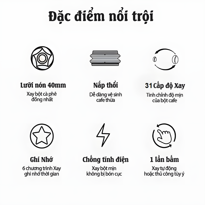 - Với lưỡi dao chất liệu thép không gỉ SS420 bền bỉ bền bỉ sở hữu 31 cấp độ xay, từ dạng thô đến dạng mịn. Chính vì thế nó có thể đáp ứng tối thiểu độ mịn cho 1 ly cà phê espresso chuẩn Ý. Thông số kỹ thuật