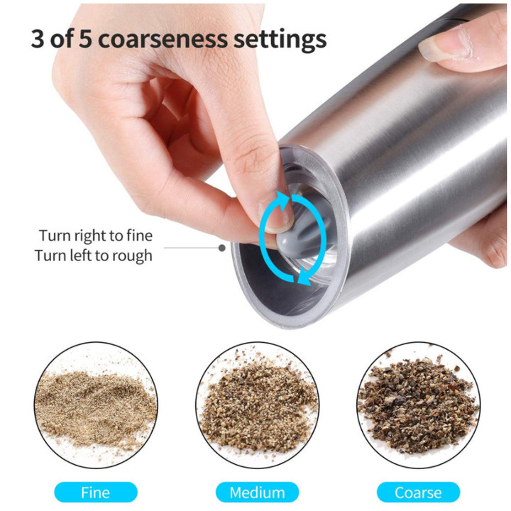 - Được sử dụng như cả máy xay tiêu điện và máy xay muối tự động với thao tác một tay đơn giản.