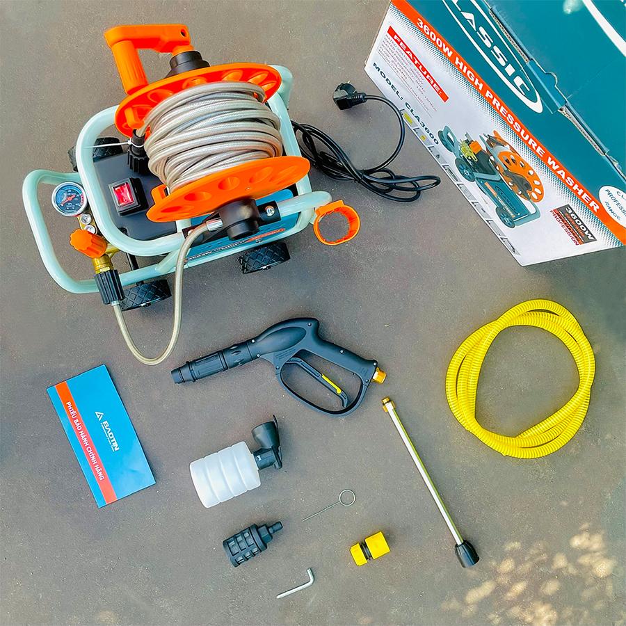 -Phụ kiện: Dây xịt áp lực: 10m/ Dây cấp nước: 2m/ Khớp nối +lọc rác/ Súng/ Bình xà bông.
