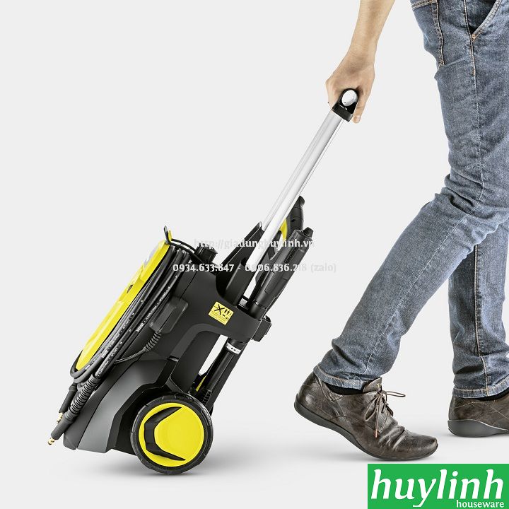 - Máy xịt rửa cao áp Karcher K5 Compact với tay cầm linh động, có thể dễ dàng kéo lên để di chuyển (hoạt động như tay kéo vali), giúp bạn khi mang từ nơi này qua nơi khách 1 cách thuận tiện.