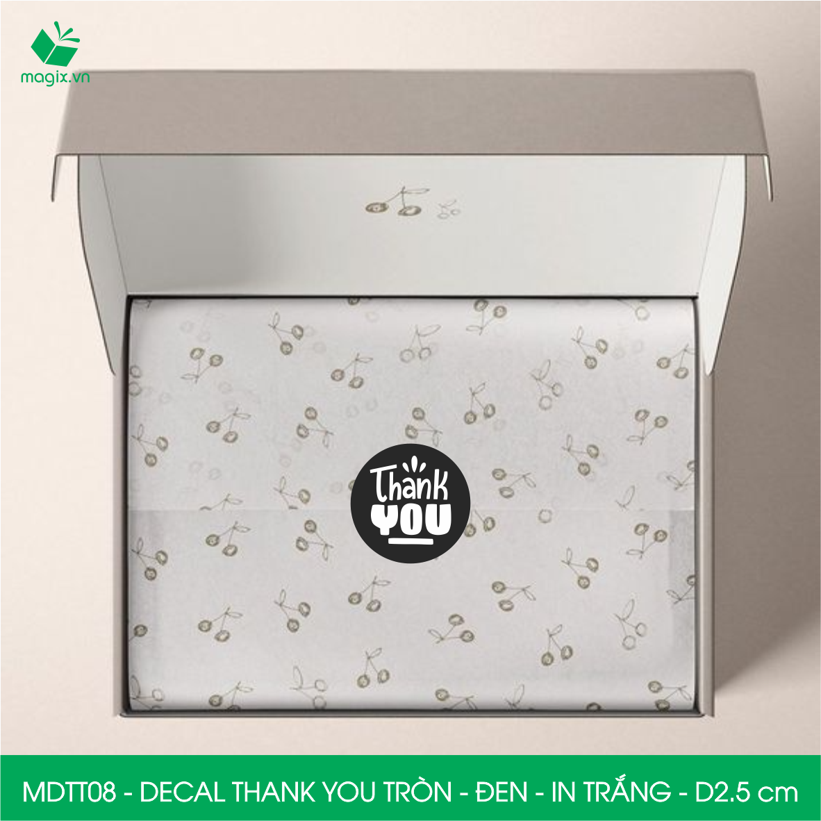 Decal - sticker Thank You là loại nhãn dán có nội dung "Cám ơn" được thiết kế theo hình tròn. Decal Thank You tròn thường được sử dụng để trang trí đóng gói thời trang, quà tặng… để thể hiện sự biết ơn, trân trọng tới người được nhận.