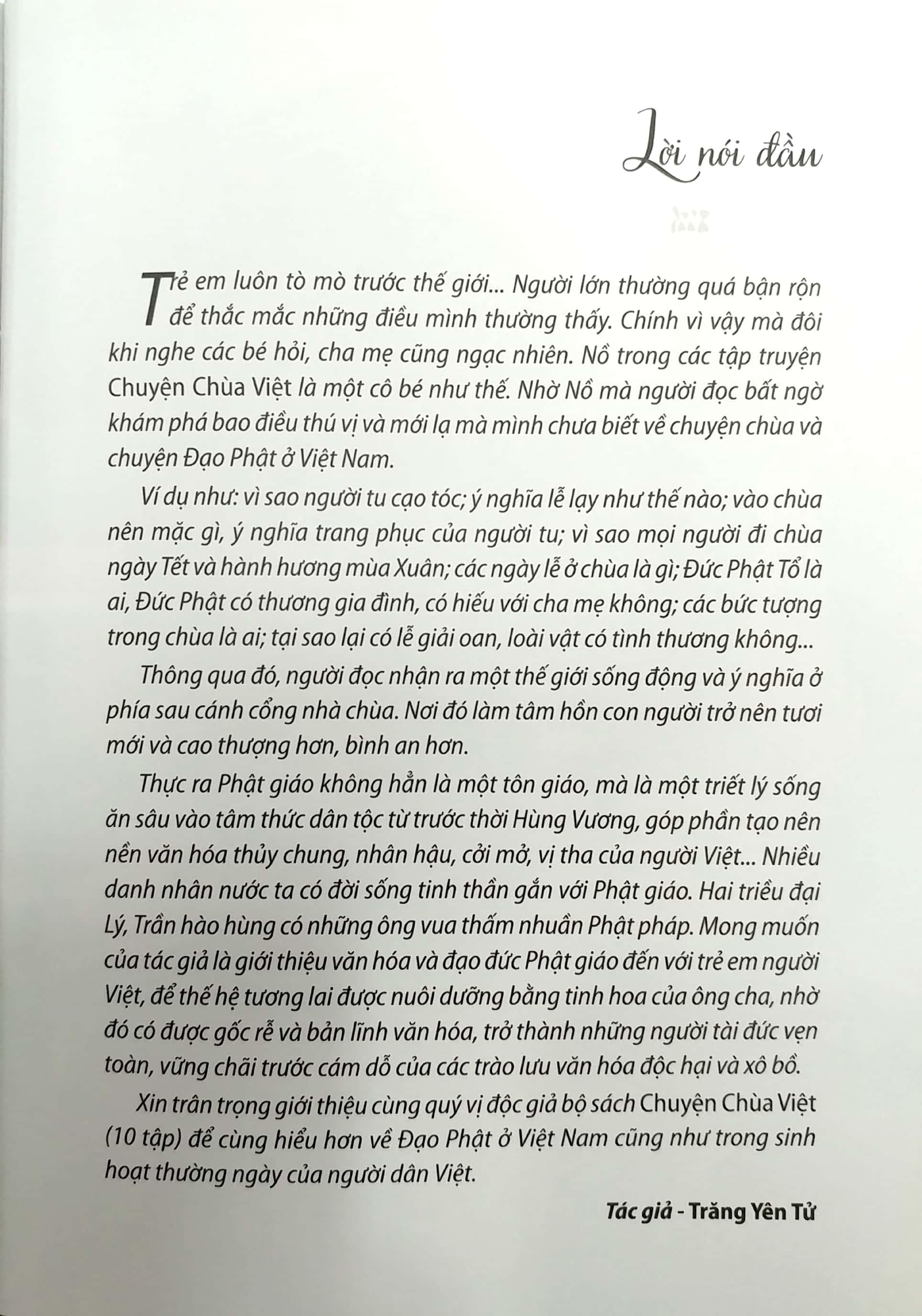 Thực ra Phật giáo không hẳn là một tôn giáo, mà là một triết lý sống ăn sâu vào tâm thức dân tộc từ trước thời Hùng Vương, góp phần tạo nên nền văn hóa thủy chung, nhân hậu, cởi mở, vị tha… Nhiều danh nhân nước ta có đời sống tinh thần gắn với Phật giáo. Hai triều đại Lý Trần hào hùng có những ông vua thấm nhuần Phật pháp. Mong muốn của tác giả là giới thiệu văn hóa và đạo đức Phật giáo đến với trẻ em người Việt, để thế hệ tương lai được nuôi dưỡng bằng tinh hoa của ông cha, nhờ đó có được gốc rễ và bản lĩnh văn hóa, trở thành những người tài đức vẹn toàn, vững chãi trước cám dỗ của các trào lưu văn hóa độc hại và xô bồ”.