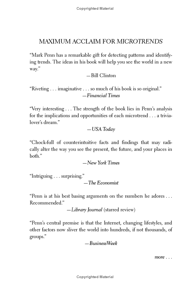 Penn shows readers how to identify the microtrends that can transform a business enterprise, tip an election, spark a movement, or change your life. In today's world, small groups can have the biggest impact.