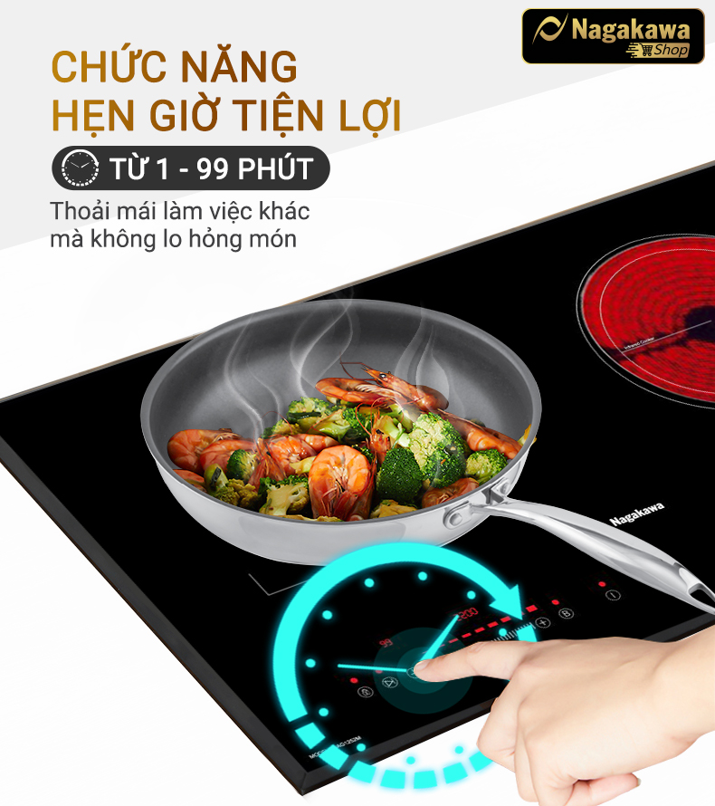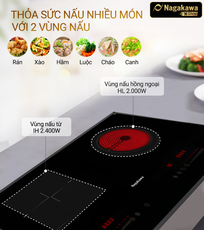 Với bếp đôi điện từ hồng ngoại Nagakawa NAG1252M, bạn hoàn toàn có thể lựa chọn chế độ hoạt động một vòng nhiệt hoặc hai vòng nhiệt.