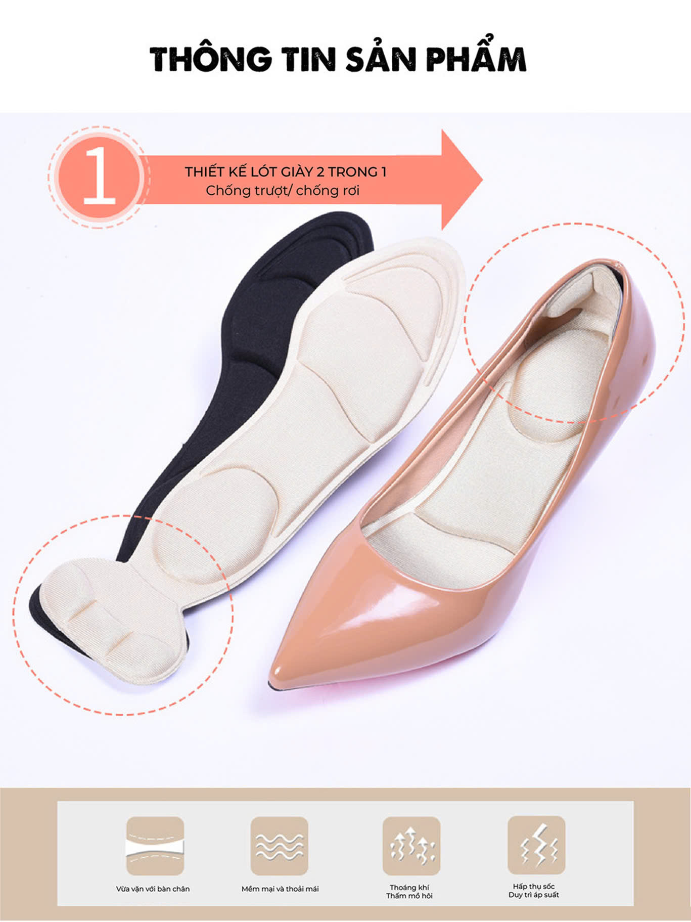 - Công dụng: miếng lót giúp giảm size giày bị rộng, chống trầy gót chân, giảm đau gang bàn chân và giảm thốn gót chân khi phải đi đứng trên giày cao gót hoặc khi mang giày bị rộng