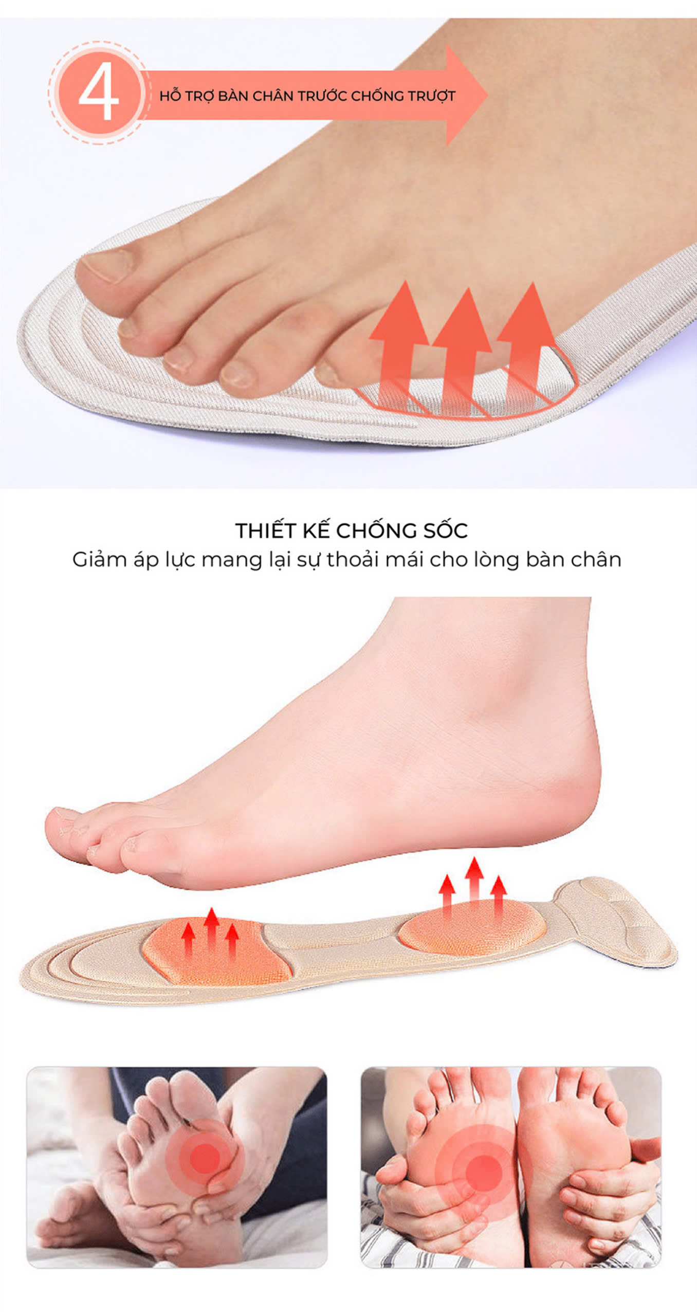 - Giảm áp lực: Lót giày cao gót giúp giảm áp lực lên các điểm tiếp xúc chính của chân, như ngón chân và gót chân. Điều này giúp giảm nguy cơ đau và mỏi chân khi đi giày cao gót trong thời gian dài.