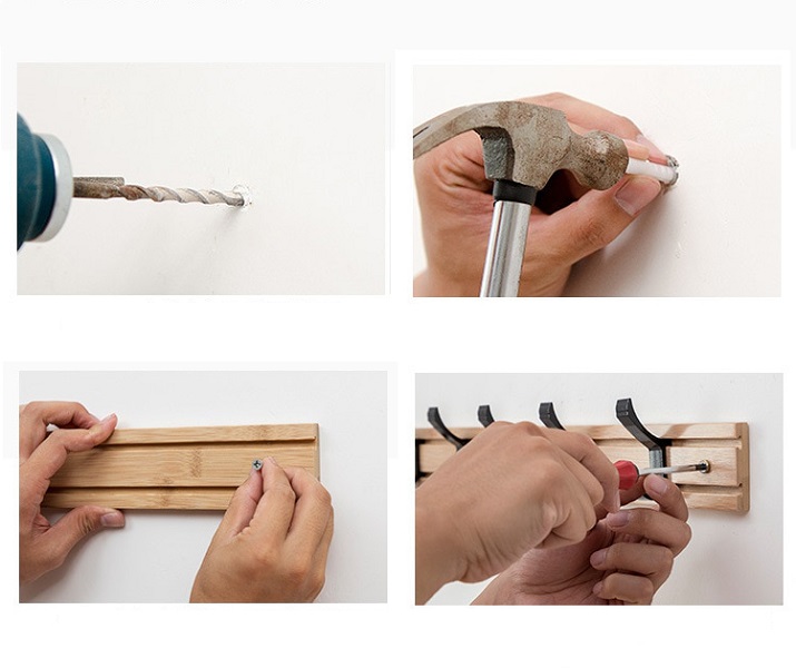 • Loại 6 đầu móc: Kích thước thanh treo gỗ: 6x1.2x60cm Móc treo đôi gồm 6 móc đôi (tương đương 12 móc đơn) Đầu móc treo Đầu móc với chất liệu hợp kim sơn tĩnh điện rất bền đẹp, chống trầy, chống gỉ sét Đầu móc treo Móc treo đôi gồ nên có thể treo rất nhiều đồ, có thể di chuyển hoặc tháo rời khi không sử dụng. Phụ kiện Phụ kiện gồm: bộ ốc vít để khoan bắt lên tường, keo dán chuyên dụng để sử dụng trong trường hợp không muốn khoan tường, miếng cao su bịt đầu ốc ví; đi kèm hướng dẫn sử dụng chi tiết Màu sắc Sản phẩm gồm 2 màu nâu tự nhiên và nâu cánh gián   Màu nâu tự nhiên Màu nâu cánh gián Hướng dẫn sử dụng Làm sạch bề mặt tường, cửa… trước khi treo móc Nếu khoan bắt vít trực tiếp vào tường, cửa… thì dùng 2 ốc vít dài và nở đi kèm cùng với miếng cao su bịt đầu ốc vít Nếu dùng keo dán thì vệ sinh sạch, khô, bằng phẳng mặt dán, bôi vài đường keo zic zac sau mặt móc. Dán móc lên rồi dùng băng keo cố định móc 15 giờ để keo thật sự kết dính rồi mới sử dụng. Hình ảnh sử dụng Móc treo quần áo gắn tường
