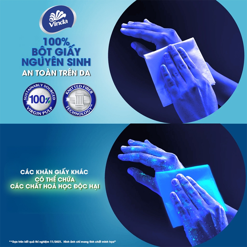 Câu chuyện thương hiệu: Các gia đình Việt Nam đang ngày càng quan tâm sâu sắc hơn về các giải pháp chất lượng và an toàn dành cho toàn bộ mọi người trong gia đình đặc biệt là trẻ nhỏ. Họ mong muốn sản phẩm không chỉ hiệu quả mà còn mang đến chất lượng thoải mái để họ có thể yên tâm về sức khỏe cũng như sự an toàn cho các thành viên trong gia đình. Vinda thấu hiểu sâu sắc và luôn nỗ lực để đáp ứng yêu cầu thích đáng của khách hàng.  Vinda mong muốn trở thành một phần không thể thiếu trong các hoạt động thường nhật của gia đình bạn. Khăn giấy Vinda sẽ mang đến sự hiệu quả cũng giống như sự bền dai vượt trội ngay cả khi ướt thông qua công nghệ Knitted Fiber chuyên biệt, qua đó, để các gia đình luôn cảm giác an tâm và thoải mái trong mọi khoảnh khắc. Giới thiệu sản phẩm: Khăn giấy rút Vinda được làm từ bột giấy nguyên chất, không chứa hóa chất tẩy trắng độc hại, an toàn cho sức khỏe người dùng. Sản phẩm Vinda bền dai ngay cả khi ướt, không để lại vụn giấy khi sử dụng Thiết kế dạng rút tiện lợi giúp lấy giấy dễ dàng, hợp vệ sinh, phù hợp sử dụng trong gia đình, văn phòng, nhà hàng, trường học hoặc mang theo khi di chuyển. Phù hợp lý tưởng để vệ sinh cá nhân như lau tay, lau mặt, hoặc vệ sinh vật dụng cá nhân, bàn ăn hay các bề mặt khác. Ngoài ra, sản phẩm cũng thích hợp dùng trong các bữa ăn, đảm bảo an toàn thực phẩm và mang lại cảm giác sạch sẽ, dễ chịu.   Hạn sử dụng và quy cách: Hạn sử dụng: 3 năm kể từ ngày sản xuất. Ngày sản xuất: in trên gói theo năm/tháng/ngày Quy cách:  Khăn giấy rút cao cấp Vinda Deluxe Size L Số lượng: 110 tờ 1 gói Số lớp: 3 lớp/ tờ Định lượng của 1 lớp giấy: 14 ± 1,0 gsm Kích thước: (189mm x 195mm) ± 5 mm Thành phần: 100% Bột giấy nguyên thủy. Bảo quản: Để nơi thoáng mát và tránh ánh nắng mặt trời