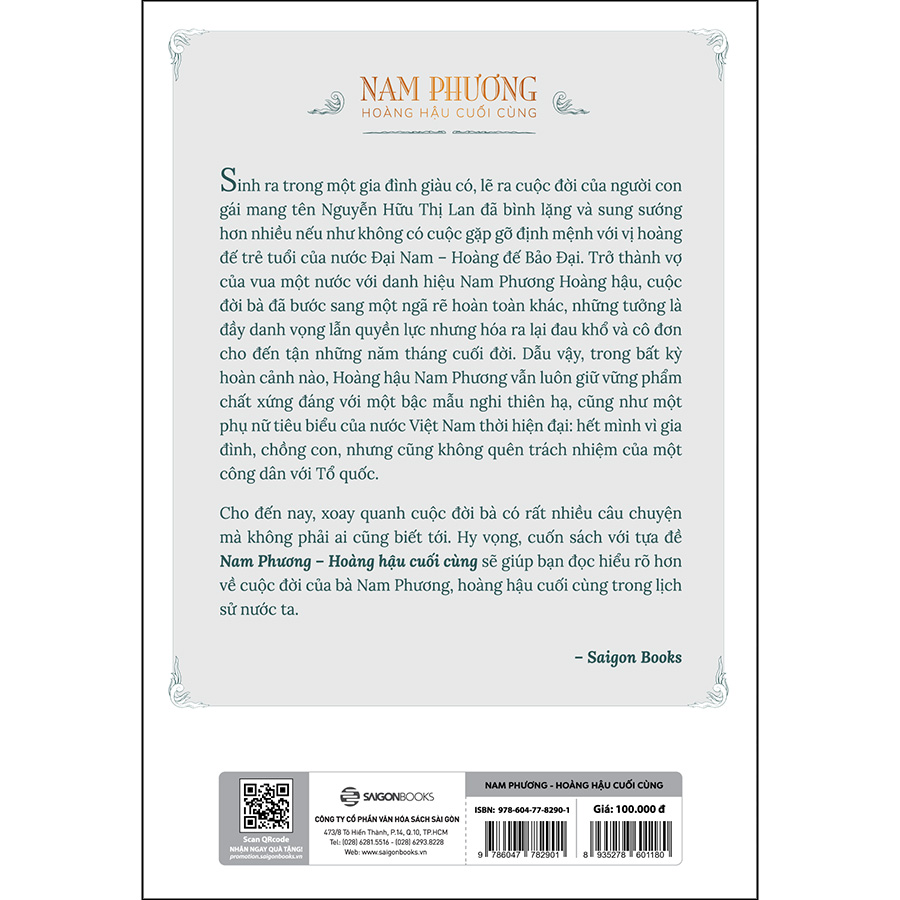 Nam Phương - Hoàng hậu cuối cùng là cuốn sách tập hợp những câu chuyện về Hoàng hậu Nam Phương, người con gái tài sắc vẹn toàn của đất Gò Công - Tiền Giang, người đã chinh phục hoàn toàn trái tim của Hoàng đế Bảo Đại để bước lên ngôi Hoàng hậu của triều Nguyễn vào năm 1934.