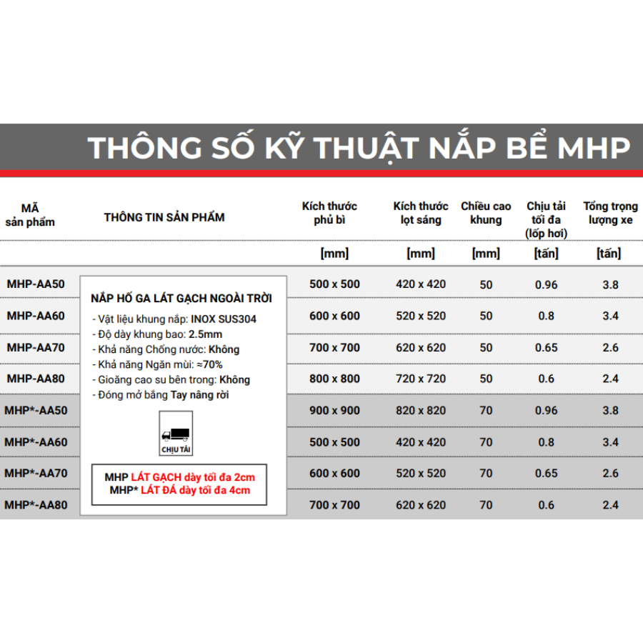 - Cấp chịu tải CLASS A (ZAVAK): 0.8 tấn/nắp, chịu tải cho xe 3.2 tấn.
