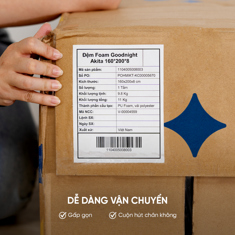 Xua tan nỗi lo mỗi khi chuyển nhà, nệm foam Goodnight có thể gấp lại làm ba và được hút cuộn chân không trong hộp nhỏ gọn nên rất tiện lợi cho việc vận chuyển và cất trữ. Nhờ công nghệ đặc biệt này mà sản phẩm tối ưu hơn các dòng nệm truyền thống, giúp tiết kiệm tối đa diện tích phòng ngủ và việc bảo quản cũng trở nên dễ dàng hơn.