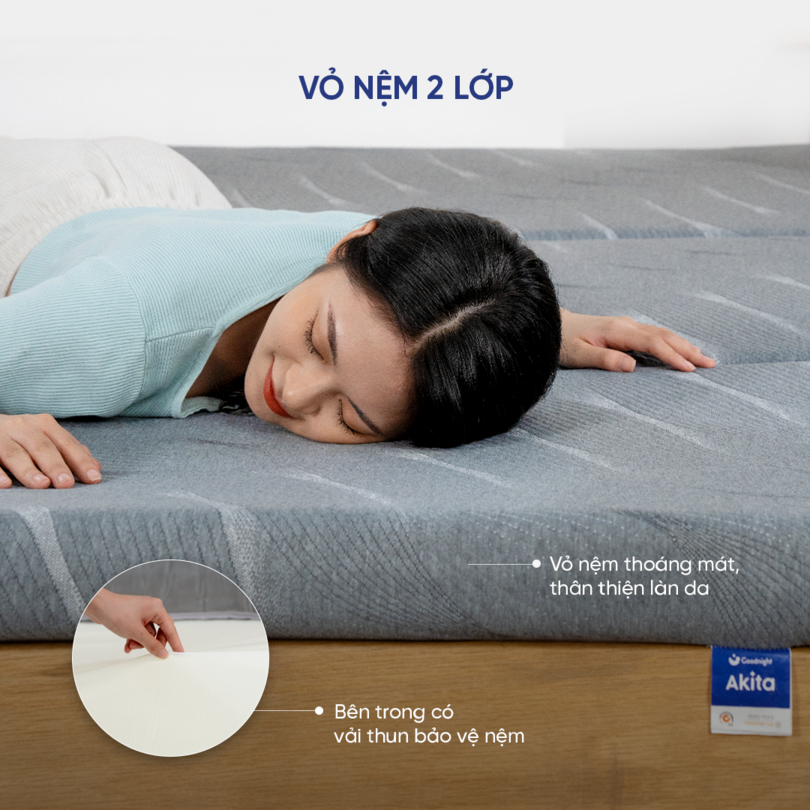 Nệm foam Goodnight Akita cho giấc ngủ khô thoáng và sạch khuẩn trong mọi thời tiết với lớp vải bọc kép.