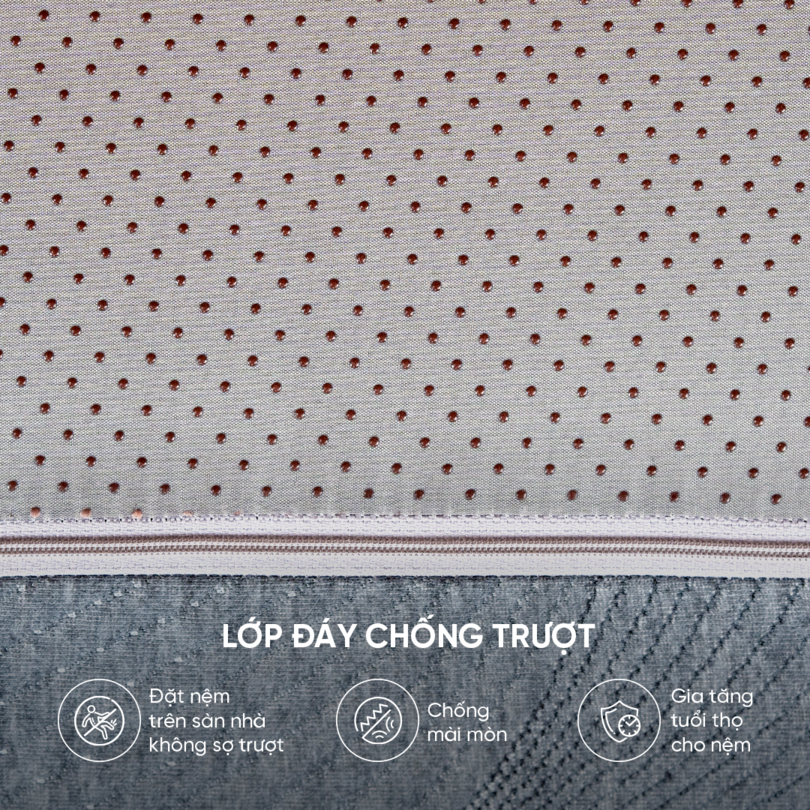 Đáy nệm Akita được thiết kế bằng vải chống trượt, giữ cho nệm cố định phù hợp với gia đình có trẻ nhỏ; đồng thời chống mài mòn giúp gia tăng tuổi thọ cho sản phẩm.
