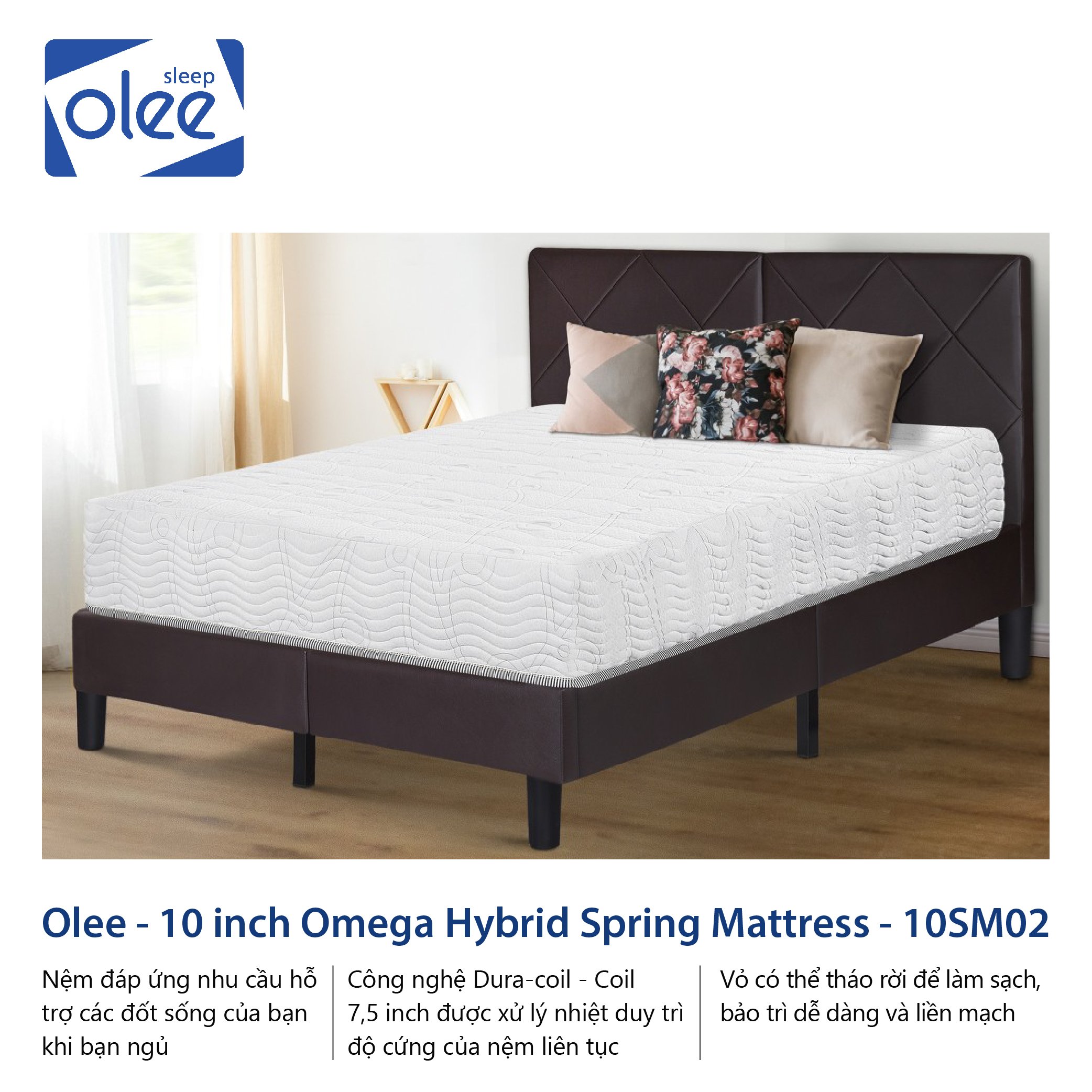 Nệm lò xo lai Omega Olee Sleep 10 inch -10SM02 : ● Bao gồm 5 lớp gồm lò xo túi ● Memory Foam mềm thích ứng với hình dạng và nhiệt độ cơ thể của