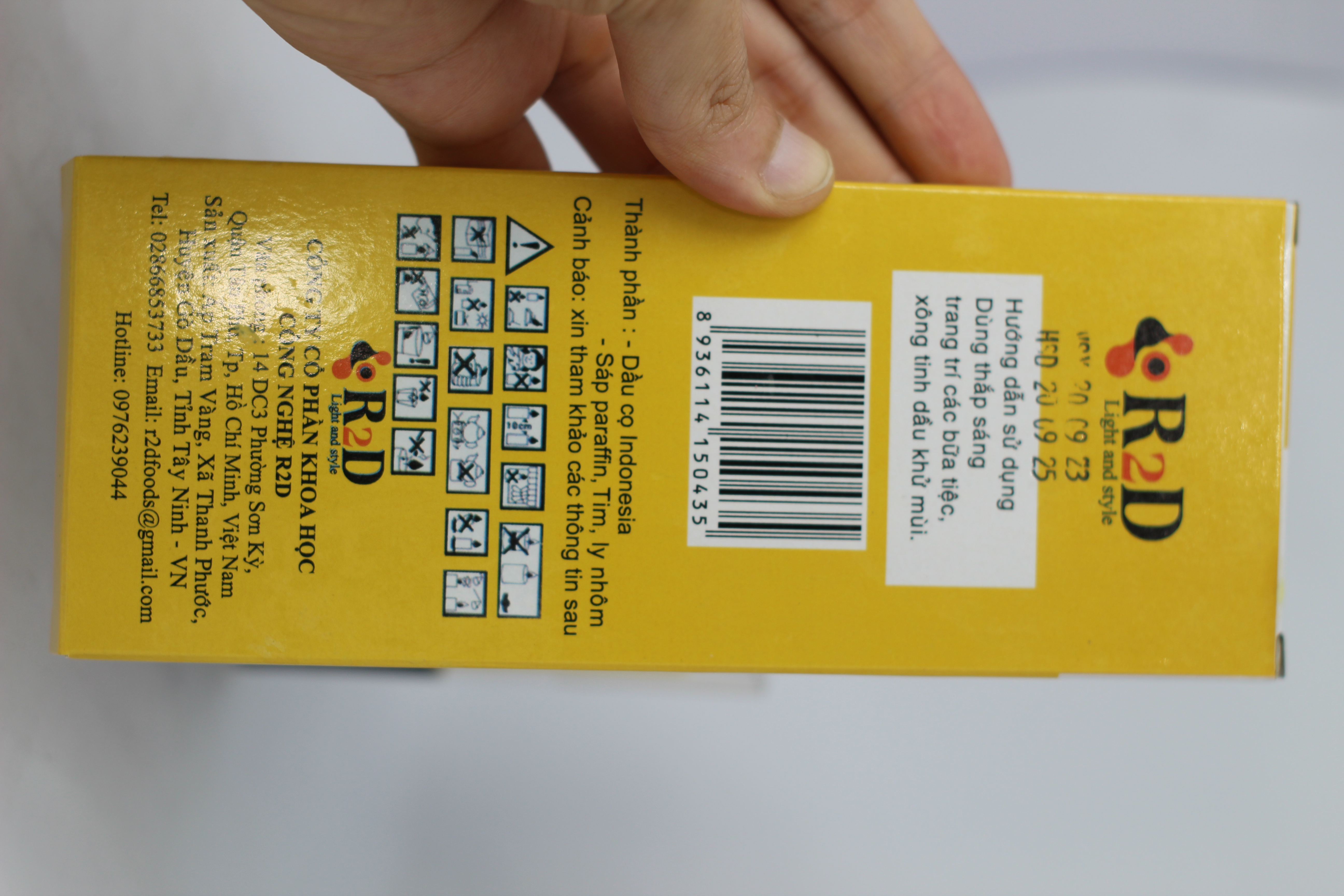 Mua tại TiktokNến Không Khói Vàng, Tealight Vàng, Nến Trà , [Vỉ 10 Viên], Chính Hãng Từ Thương Hiệu R2D, Làm Từ Nguyên Liệu Tự Nhiên, Lành Tính. - Nến Không Khói, Vàng dùng thắp sáng, trang trí, trang trí nội thất, sân vườn, tiệc cưới. Là sản phẩm cần thiết để dùng với đèn xông tinh dầu. - Nến khi đốt dễ chịu, thoải mái, không khói, không mùi, cháy sạch không tàn, không bị tắt trong lúc cháy. - Sử dụng tốt cho những người dị ứng với mùi hương hoặc kết hợp với đèn xông tinh dầu để tạo mùi thơm, khử sạch mùi hôi, đuổi côn trùng, làm không khí trong lành. Thành phần: Dầu cọ, sáp dừa organic. Định lượng: 100 g (7.5x19x1.5). Thời gian đốt: 4 giờ trong điều kiện phù hợp. - Kiểu dáng nến đẹp mắt, ấn tượng tạo sự sinh động, tinh tế cho không gian của bạn, có thể dùng cho gian phòng, gia đình, nhà hàng, khách sạn… - Nến Không Khói được làm hoàn toàn từ tinh chất tự nhiên kết hợp với sáp cọ organic cao cấp. HƯỚNG DẪN SỬ DỤNG NẾN - Đốt trực tiếp hoặc sử dụng chung với đèn xông tinh dầu. - Có thể tái sử dụng nhiều lần . - Bảo quản nơi khô ráo thoáng mát, tránh nhiệt độ cao.