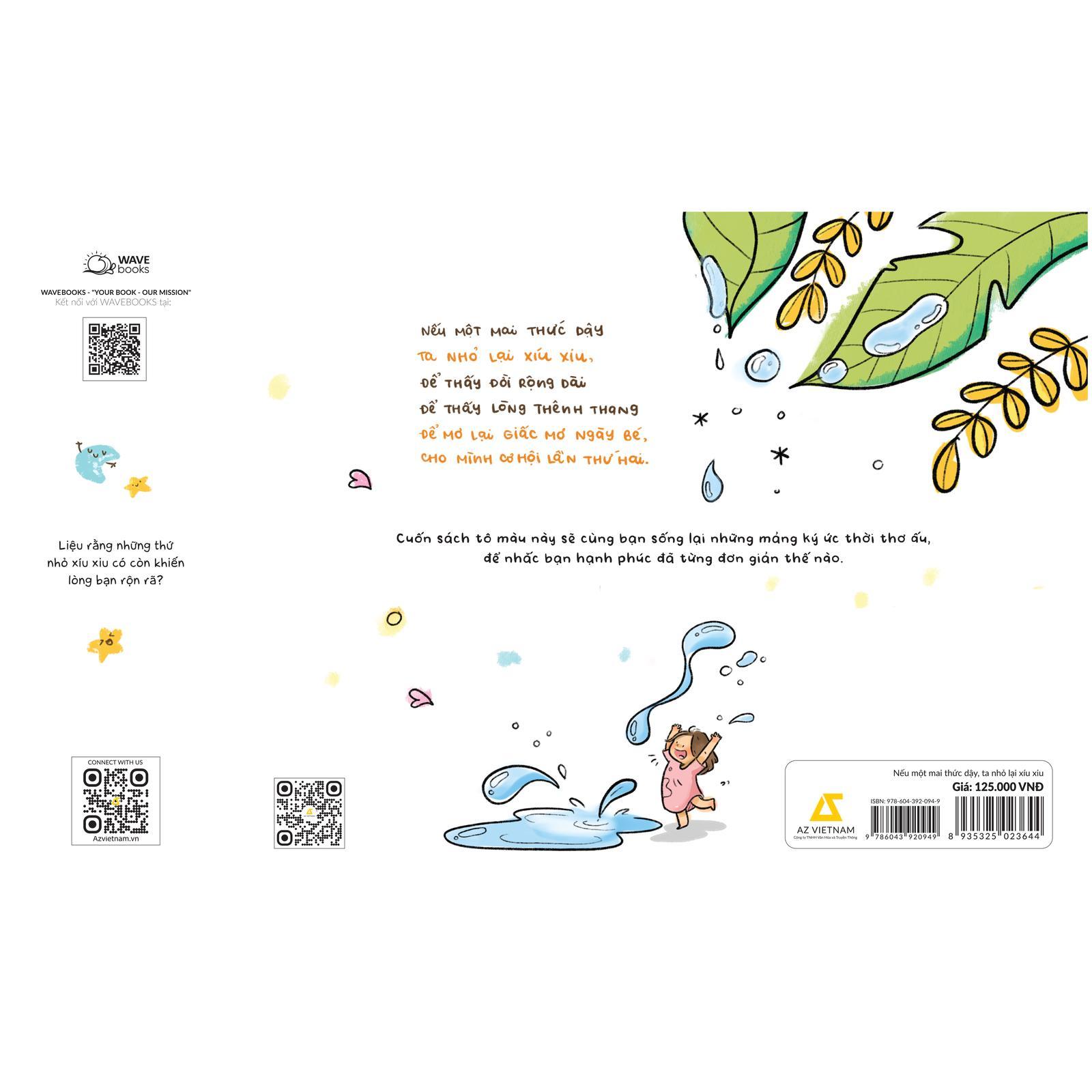 Nếu một mai thức dậy, ta nhỏ lại xíu xiu là một cuốn sách không chứa nhiều câu từ, nhưng mỗi trang sách phủ đầy những phác họa gợi lên hình ảnh tuổi thơ, đang chờ bạn “tô tô vẽ vẽ”. Mỗi nét vẽ là một sợi dây kéo bạn về gần với ngày thơ ấu, nhắc bạn nhớ những niềm vui nho nhỏ đã bị thời gian và sự khắc nghiệt của cuộc sống chôn vùi từ rất lâu.