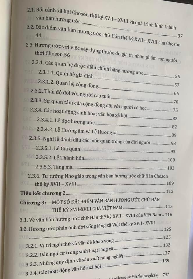 • Nghiên cứu một cách hệ thống hương ước hai nước giai đoạn thế kỷ XVII - XVIII góp phần vun đắp vào sự nghiệp xây dựng cũng như giữ gìn và phát huy những truyền thống tốt đẹp của làng xã thời hiện đại. Nghiên cứu hương ước giai đoạn này góp phần tìm hiểu quan điểm cũng như sự định hướng của tầng lớp Nho sĩ hai nước trong việc ổn định tình hình chính trị xã hội và vấn đề giáo dục con người trong quá khứ, hiện tại và tương lai. Chuyên luận góp phần thiết thực cho quá trình tìm hiểu nghiên cứu về hương ước của các nước đồng văn. Từ đó có thể xem chuyên luận này là tài liệu tham khảo có giá trị cho công tác nghiên cứu văn hóa làng. Đây là lần đầu tiên hương ước chữ Hán thế kỷ XVII – XVII của Triều Tiên và Việt Nam được tập hợp hệ thống. Thông qua phương pháp thống kê, phân tích, định lượng theo những nội dung cụ thể, chuyên luận mong muốn mang lại cho giới nghiên cứu những thông tin cơ bản về hương ước của hai nước, phần nào giúp tái hiện lại cuộc sống sinh hoạt làng xã ở Triều Tiên và Việt Nam trong cùng một giai đoạn lịch sử nhất định. Từ đó, vạch ra cách thức xây dựng văn hóa làng xã thời hiện đại trên chất liệu ưu việt của văn hóa cổ truyền. Nội dung của tập sách gồm hai phần: Phần 1: Nghiên cứu văn bản hương ước chữ Hán thế kỷ XVII - XVIII của Choson và Việt Nam. Phần II: Trích dịch các văn bản hương ước chữ Hán thế kỷ XVII – XVIII của Choson và Việt Nam và các bảng biểu liên quan đến toàn bộ nội dung của tất cả các chương.