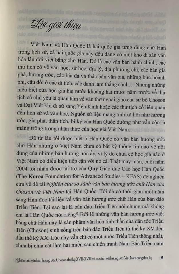 Ngày nay hòa vào xu thế hội nhập quốc tế, bên cạnh việc Phát triển quan hệ hợp tác đối ngoại, không thể không nhắc đến việc cần thiết phải phát huy bản sắc văn hóa dân tộc. Điều này trở nên vô cùng quan trọng đối với sự tồn vong và phát triển của mỗi quốc gia, nhất là những nước có hoàn cảnh lịch sử cũng như trình độ phát triển tương đồng nhau. Việt Nam và Triều Tiên là hai nước trong khu vực Đông Bắc Á, với nhiều điểm giống nhau về vị trí địa lý, dữ kiện lịch sử, trình độ phát triển, đặc biệt là cách quản lý dân bằng hương ước ở từng đơn vị tụ cư. Lãnh thổ Việt Nam và Triều Tiên vừa gắn với lục địa vừa thông với đại dương, sản vật và tài nguyên phong phú, có đường bờ biến kéo dài, xây dựng được nhiều cảng biển tiếp cận với thế giới. Với những ưu thế của vị trí địa lý, trong lịch sử Việt Nam và Triều Tiên luôn là mảnh đất khát vọng để xâm chiếm của các triều đại Trung Quốc và Nhật Bản. Vì vậy, nhu cầu bảo vệ biên cương đất nước đã tạo cho Việt Nam và Triều Tiên có sự tương đồng về quan điểm, mục đích để gìn giữ nền hòa bình. Trong suốt chặng đường phát triển, các vấn đề làng xã và quản lý làng xã phản ánh nhu cầu tự thân vận động của từng đơn vị tụ cư mỗi nước. Trong kho tàng di sản văn hóa thành văn của các nước đồng văn (Nhật Bản, Triều Tiên, Việt Nam), một thời từng chịu ảnh hưởng của văn hóa và văn tự Trung Hoa, hương ước được nhắc đến như minh chứng lịch sử phản ảnh sâu sát nhất đời sống tâm lí của cư dân làng. Đó chính là một loại văn bản mang tính lệ tục gắn liền với hoản cảnh, phong tục, tập quán lâu đời của từng làng xã. Sẽ không cần phải lý giải vì sao trong dân gian truyền tụng câu: "đất vua, chùa làng" hay “phép vua thua lệ làng". Hương ước có ý nghĩa cực kỳ quan trọng đối với cư dân làng xã trong việc ổn định xã hội cũng như xây dựng nền văn hóa dân tộc mà ngày nay cơ hồ bị lãng quên bởi lối sống của nền văn minh công nghiệp. Chính vì vậy, việc nghiên cứu hương ước của Triều Tiên và Việt Nam trong một giai đoạn lịch sử nhất định là tổng kết, đánh giá điểm tiến bộ và hạn chế trong hương ước hai nước. Hương ước của Triều Tiên và Việt Nam là đối tượng nghiên cứu của nhiều công trình khoa học của nhiều học giả trong và ngoài nước. Tuy nhiên, hiện nay chưa có một chuyên luận nào nghiên cứu một cách hệ thống hương ước chữ Hán của cả hai nước trong giai đoạn lịch sử cụ thể. Xuất phát từ tình hình hợp tác hữu nghị hai nước Việt Nam và Triều Tiên, nhu cầu nghiên cứu hương ước và tìm hiểu những nét dị đồng trong văn bản hương ước chữ Hán của Việt Nam và Triều Tiên trong một giai đoạn lịch sử nhất định, chúng tôi tiến hành nghiên cứu chuyên luận "Nghiên cứu văn bản hương ước Choson thế kỷ XVII- XVIII và so sánh với hương ước Việt Nam cùng thời kỳ". Sở dĩ chúng tôi chọn nghiên cứu hương ước chữ Hán ở thế kỷ XVII - XVIII vì vào thời kỳ này trong khi hương ước ở Triều Tiên đã được văn bản hóa, phát triển mạnh và có ảnh hưởng sâu đậm đến cách sống, ứng xử xã hội của người Triều, thì ở Việt Nam hương ước được văn bản hóa chỉ mới xuất hiện rải rác ở một số làng trong khi cả Việt Nam và Triều Tiên đều tiếp thu, chịu ảnh hưởng của Nho giáo và văn hóa Trung Hoa từ thởi kỳ cổ, trung đến cận đại. Biểu hiện cụ thể ở hai thế kỷ này là cả hai nước vẫn đưa ra nhiều chính sách khuyến khích Nho giáo, lập nên các trường Quốc học, ban bố quy định thi cử, đào tạo đội ngũ Nho quan phục vụ vương triều. Chuyên luận này với mong muốn chỉ ra những nét đặc sắc trong phong tục làng xã cổ truyền của hai nước đồng văn, trên hết là góp phần vào việc bảo tồn, chấn hưng văn hóa làng xã trong thời kỳ hội nhập và giao lưu trên thế giới. Nội dung phản ánh của hương ước hai nước rất phong phú, đa dạng bao quát toàn bộ đời sống xã hội của người dân hai nước bấy giờ. Vì vậy, nghiên cửu hương ước giai đoạn này là việc làm vừa mang ý nghĩa lý luận vừa mang ý nghĩa thực tiễn. Về mặt lý luận: