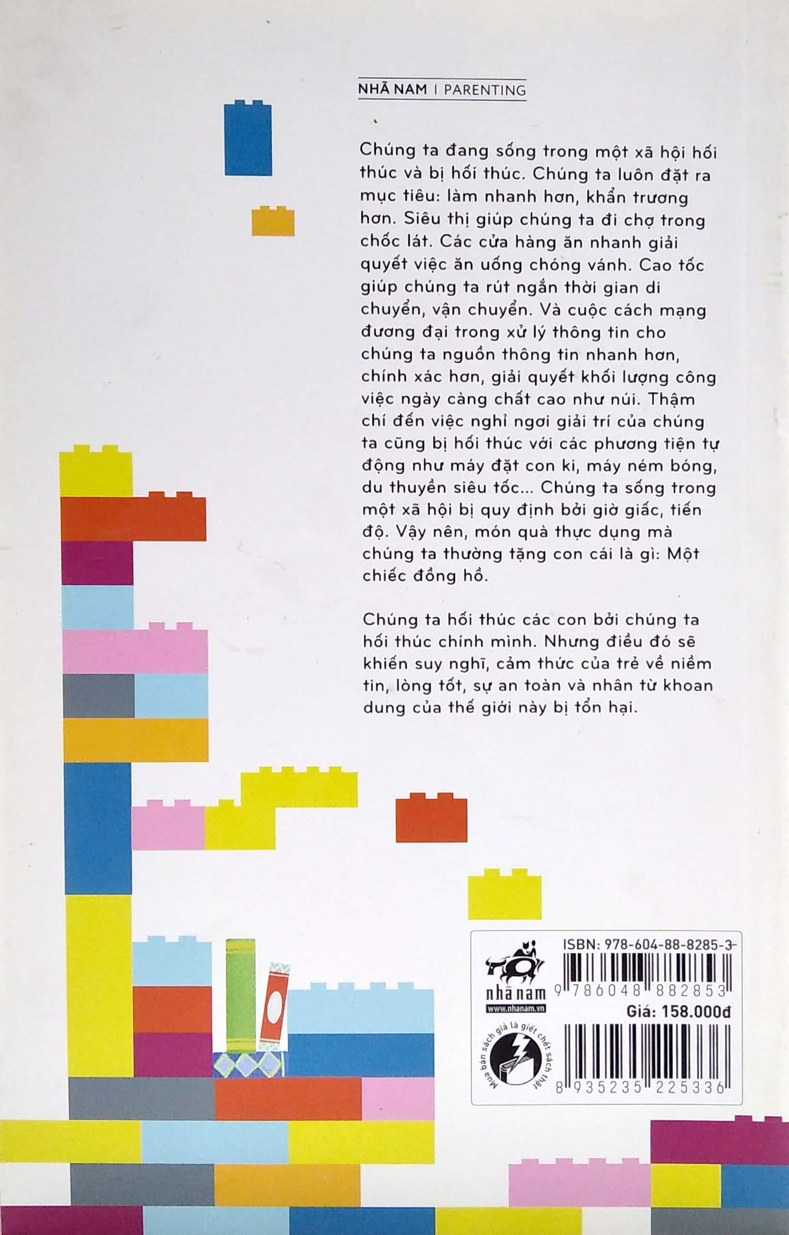 Chúng ta đang sống trong một xã hội hối thúc và bị hối thúc. Chúng ta luôn đặt ra mục tiêu: làm nhanh hơn, khẩn trương hơn. Siêu thị giúp chúng ta đi chợ trong chốc lát. Các cửa hàng ăn nhanh giải quyết việc ăn uống chóng vánh. Cao tốc giúp chúng ta rút ngắn thời gian di chuyển, vận chuyển. Và cuộc cách mạng đương đại trong xử lý thông tin cho chúng ta nguồn thông tin nhanh hơn, chính xác hơn, giải quyết khối lượng công việc ngày càng chất cao như núi. Thậm chí đến việc nghỉ ngơi giải trí của chúng ta cũng bị hối thúc với các phương tiện tự động như máy đặt con ki, máy ném bóng, du thuyền siêu tốc… Chúng ta sống trong một xã hội bị quy định bởi giờ giấc, tiến độ. Vậy nên, món quà thực dụng mà chúng ta thường tặng con cái là gì: Một chiếc đồng hồ. Việc hối thúc trẻ đang trở thành lối sống được xã hội chấp nhận, thậm chí coi trọng. Sự hối thúc đi kèm với sự thiếu kiên nhẫn. Vì sao? Vì việc hối thúc phản ánh các giá trị văn hóa, ví dụ như văn hóa đúng giờ, và viện đến các giá trị đó người ta sẽ biện hộ cho việc hối thúc trẻ. Chúng ta hối thúc các con bởi chúng ta hối thúc chính mình. Nhưng điều đó sẽ khiến suy nghĩ, cảm thức của trẻ về niềm tin, lòng tốt, sự an toàn và nhân từ khoan dung của thế giới này bị tổn hại.