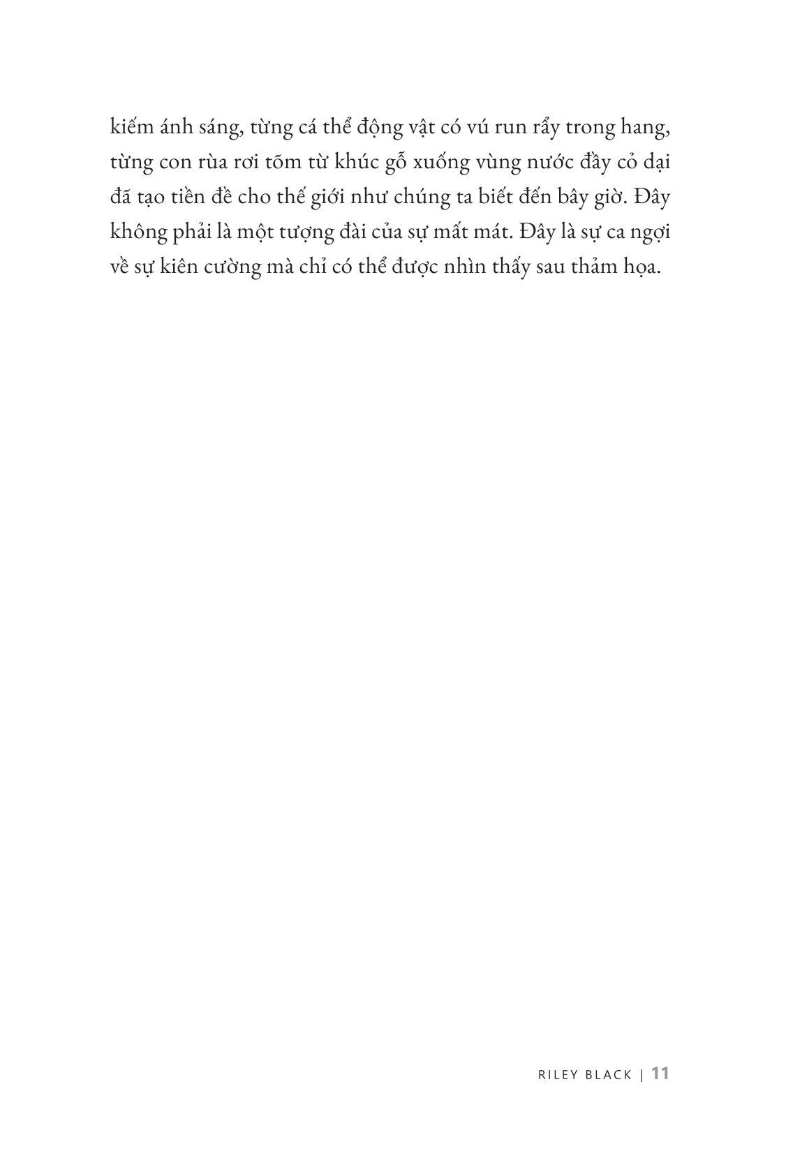 Những Ngày Cuối Cùng Của Khủng Long - Thiên Thạch, Sự Tuyệt Chủng Và Khởi Đầu Của Thế Giới Chúng Ta Có chút lạ đời khi biết rằng phần lớn kỷ nguyên hiện đại tồn tại nhờ sự tàn phá của đại thảm họa tuyệt chủng Phấn Trắng–Cổ Cận (K–Pg). Các sự kiện địa chất như thế này đã tạo điều kiện phá hủy hệ sinh thái của Trái Đất trên quy mô lớn về các khía cạnh môi trường thiết yếu như mực nước biển và bầu khí quyển. Những sinh vật không thể thích nghi – nổi bật nhất là các loài khủng long từng thống trị mặt đất trong thời gian dài – đã dần bị đào thải. Ấy vậy mà thế giới như chúng ta biết ngày hôm nay lại chính là sự nảy nở tiếp sau thảm họa kéo dài, khi mà sự sống không chỉ quay trở lại mà còn được định hình lại bởi chính thảm họa đó. Dưới một góc độ rất chuẩn xác về khoa học nhưng cũng đầy nhân văn, tác giả Riley Black đã tiếp cận đại thảm họa khi xưa như một câu chuyện bi kịch nhưng giàu hy vọng về bản chất mạnh mẽ của sự sống trên hành tinh của chúng ta.