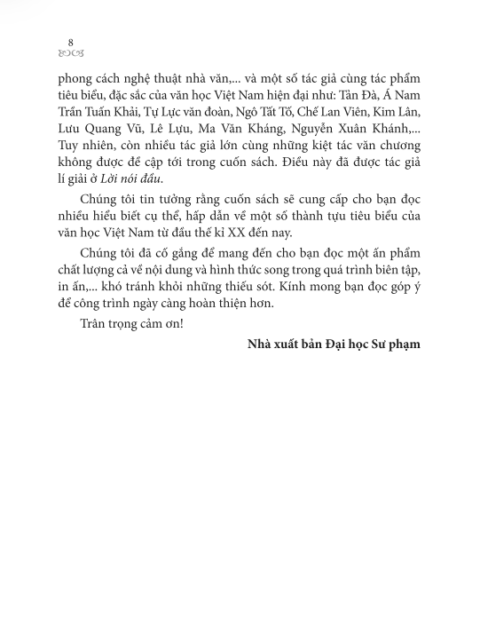 Chúng tôi tin tưởng rằng đọc cuốn sách này, bạn đọc sẽ có thêm nhiều hiểu biết cụ thể, hấp dẫn về một số thành tựu tiêu biểu của văn học Việt Nam từ đầu thế kỉ XX đến nay – thời kì văn học Việt Nam phát triển theo hướng hiện đại hoá với nhịp độ phát triển mau lẹ, đạt nhiều thành tựu rực rỡ.