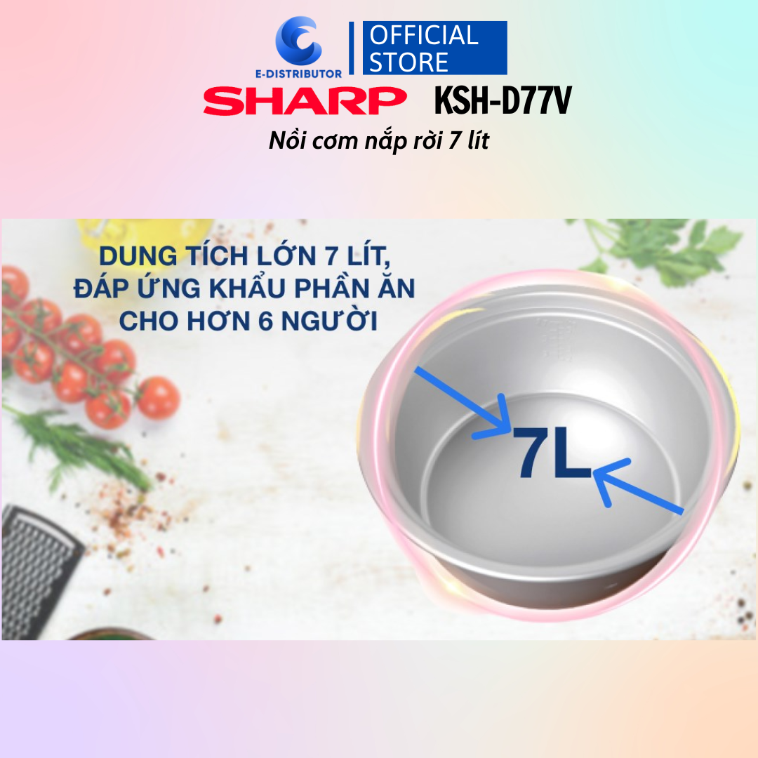 Nồi cơm nắp rời Sharp 7 lít KSH-D77V nhập khẩu từ Thái Lan, nấu cơm chín nhanh nhờ công nghệ nấu 1D, dung tích lớn 7 lít, nút gạt dễ thao tác,... hỗ trợ chế biến khẩu phần cơm cho gia đình đông người hay quán ăn.