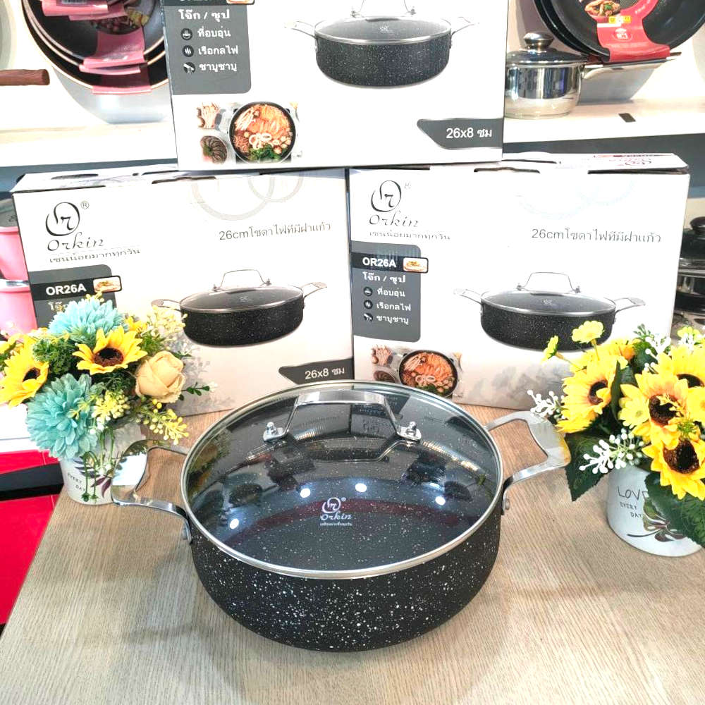 Nồi lẩu chống dính vân đá cẩm thạch Orkin Thái Lan OR26A/OR28A size 26/28cm vung kính đáy từ