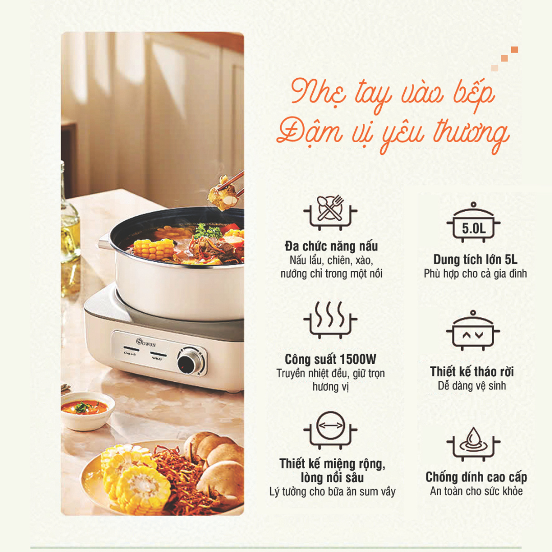 Đặc điểm nổi bật Nồi lẩu điện đa năng: Lẩu, chiên, xào, rán, hấp, luộc Dung tích lớn 5.0 lít, phù hợp cho nhu cầu 4 - 6 người. Thiết kế tiện dụng, tháo lắp dễ