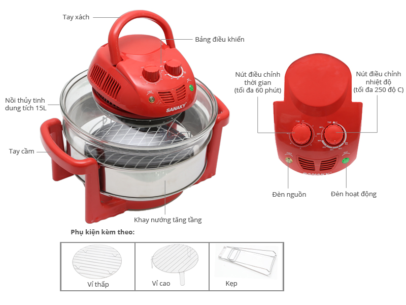 ·Nguồn điện: 220-240V/50-60Hz; ·Bộ chỉnh nhiệt độ: 00C -2500C; . Bộ định thời gian : 0'-60' ·Bộ vi mạch điều chỉnh nhiệt tự động giúp tiết kiệm điện. ·Khoang lò bằng thủy tinh chịu nhiệt