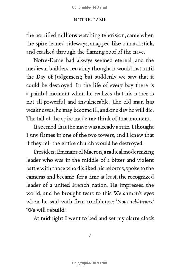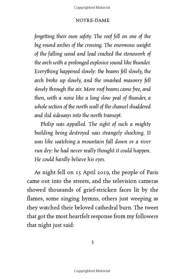 ‘Two days after Notre Dame burned, I flew to Paris to appear on the TV programme La Grande Librairie for a discussion about cathedrals. The following morning I had breakfast at the Hotel Bristol with my French publisher and she asked me to write a short book about Notre Dame and what it means to all of us. She said she would donate the publisher’s profits to the rebuilding fund and, if I wished, I could do the same with my royalties. Yes, I said; of course, I’d love to.’ Ken Follett