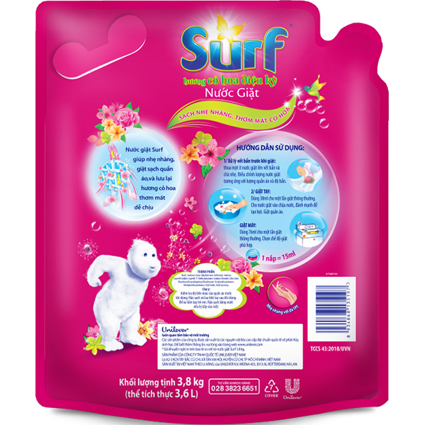 - Surf Nước Giặt Hương Cỏ Hoa Diệu Kỳ Túi (3.8kg) với hương cỏ hoa thơm mát, tinh tế, giúp áo quần luôn thơm tho dễ chịu. - Hương cỏ hoa diệu kỳ, thơm mát
