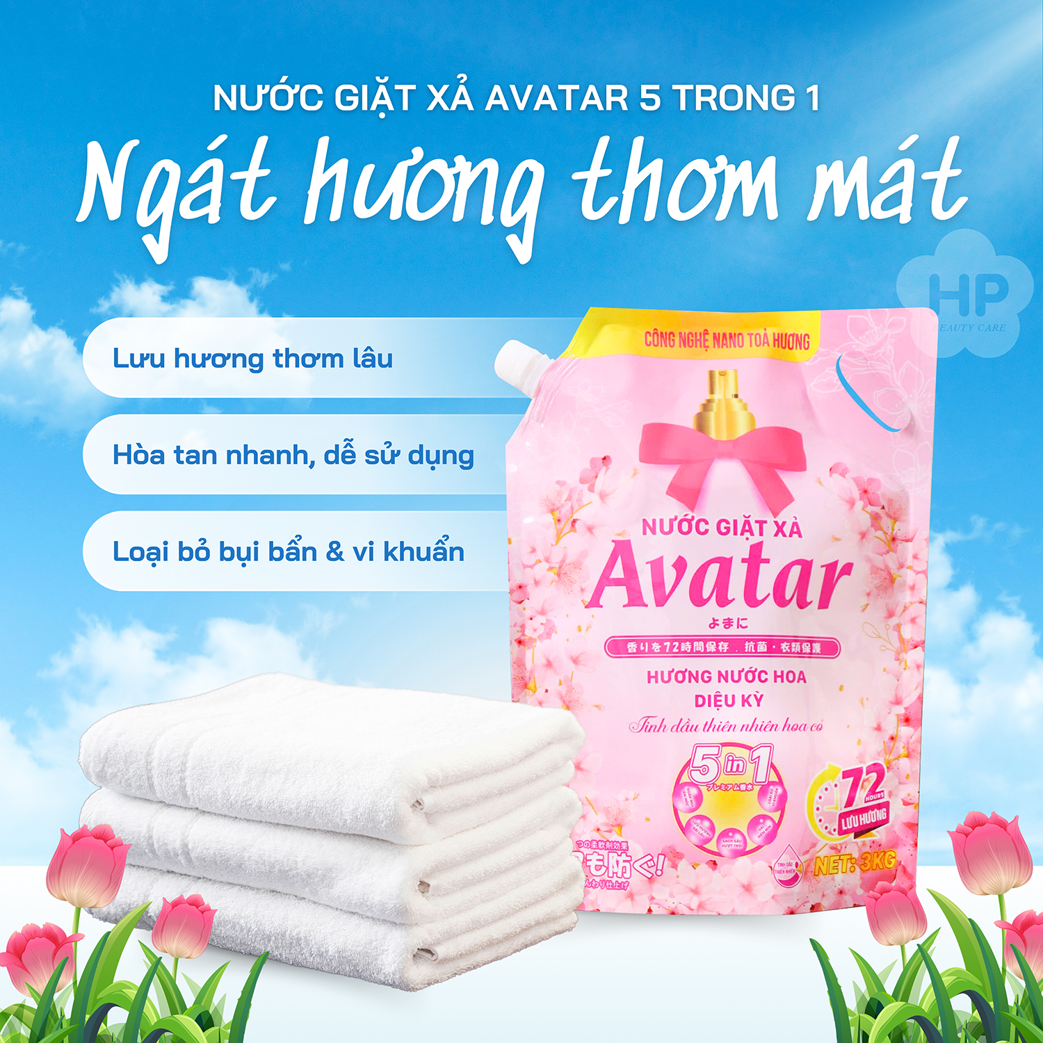 NƯỚC GIẶT XẢ AVATAR 5 TRONG 1 HƯƠNG HOA CỎ LƯU HƯƠNG 72H (TÚI 3KG) Số Lô: in trên sản phẩm Xuất Xứ: Việt Nam Khối lượng tịnh: 3kg Mã Vạch: 8936183971054 Công dụng
