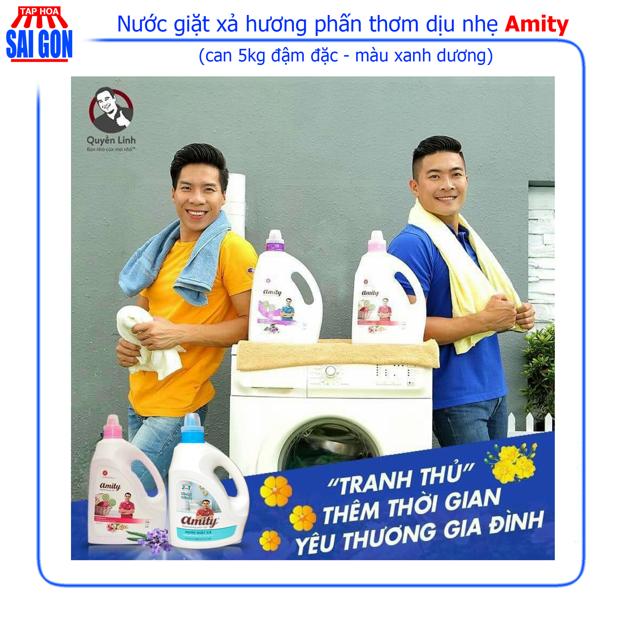 Nước Giặt Xả Amity hương phấm thơm dịu nhẹ (xanh dương) can 5kg giúp giữ mùi thơm nhẹ nhàng suốt cả ngày, một thương hiệu của MC Quyền Linh Với công nghệ tích hợp 2 chức năng giặt và xả. Nước giặt xả Amity 2 trong 1 len lỏi, thấm sâu từng sợi vải giúp cho quần áo luôn sạch khuẩn, không bay màu và thơm mát cả ngày Màu xanh dương hương phấn thơm dịu nhẹ với công nghệ lưu hương nhẹ nhàng cho quần áo suốt cả ngày. Sản phẩm được sản xuất tại Việt Nam Với công nghệ tích hợp 2 chức năng giặt và xả. Nước giặt xả Amity 2 trong 1 len lỏi, thấm sâu từng sợi vải giúp cho quần áo luôn sạch khuẩn, không để lại chất cặn trên quần áo giống như các loại bột giặt thông thường. Được áp dụng công nghệ cao với khả năng diệt khuẩn và lưu giữ hương thơm bền lâu ngay cả sau khi phơi. Sản phẩm đang được Tạp hóa Sài Gòn áp dụng giao hàng miễn phí toàn quốc