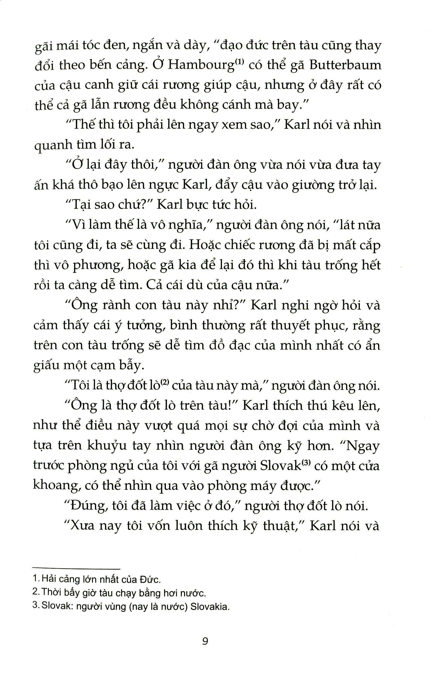 Cập cảng New York trên một con tàu lớn khủng khiếp, Karl Roßmann, kẻ tội đồ từng gây tội lỗi tình ái ở quê hương được chào đón bởi Nữ thần Tự do giương cao thanh kiếm giữa bầu trời lồng lộng. Cảnh tượng bỗng đột nhiên trở nên chói lọi. Từ đây, Karl rơi thẳng vào vòng xoáy rủi may may rủi đến chóng mặt. Karl đã trải nghiệm cuộc sống lên voi xuống chó khôn lường dở cười dở khóc nơi miền đất của những cơ hội thần kỳ. Và tương lai của cậu là gì? Điều đó không ai biết, bởi vì tiểu thuyết đã dừng bước ngay khi chuyến tàu đưa nhân vật chính đến vùng đất có cái tên hư hư thực thực – Oklahama – chỉ vừa mới khởi hà