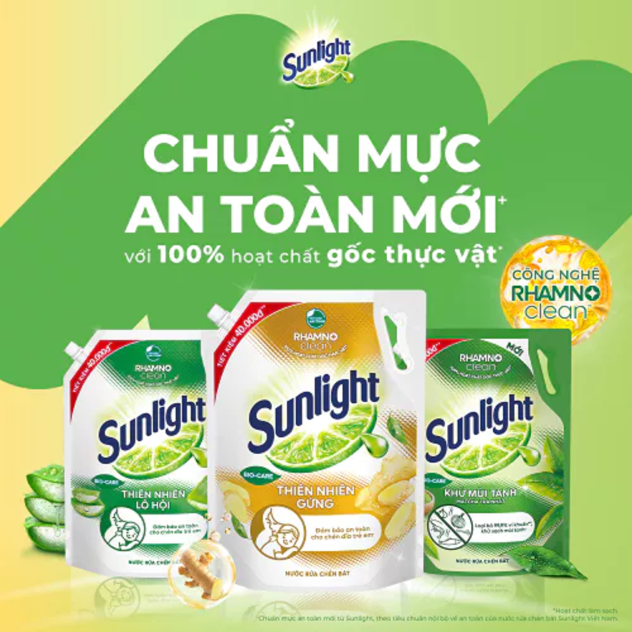 Mua tại TiktokMÔ TẢ SẢN PHẨM Sunlight ra mắt Nước rửa chén bát Sunlight Bio-care Mới với công nghệ độc quyền Rhamno Clean chứa 100% hoạt chất làm sạch gốc thực vật. Với cải tiến trong công thức, Sunlight Bio-care Mới mang đến chuẩn mực an toàn mới, đảm bảo an toàn cho chén dĩa trẻ em và cũng rất thân thiện với môi trường. Sunlight cam kết 0% hóa chất độc hại đến gần gia đình bạn, đảm bảo an toàn & lành tính. Công thức độc quyền: Thành phần làm sạch từ đường thiên nhiên lên men nhờ vi sinh vật có lợi, 100% hoạt chất gốc thực vật. 0% thành phần làm sạch gốc dầu mỏ & 0% phẩm màu & 0% paraben 99.7% phân hủy sinh học Bao bì nhựa tái sinh (tính trên loại bao bì từ chai) 3 công nặng vượt trội: