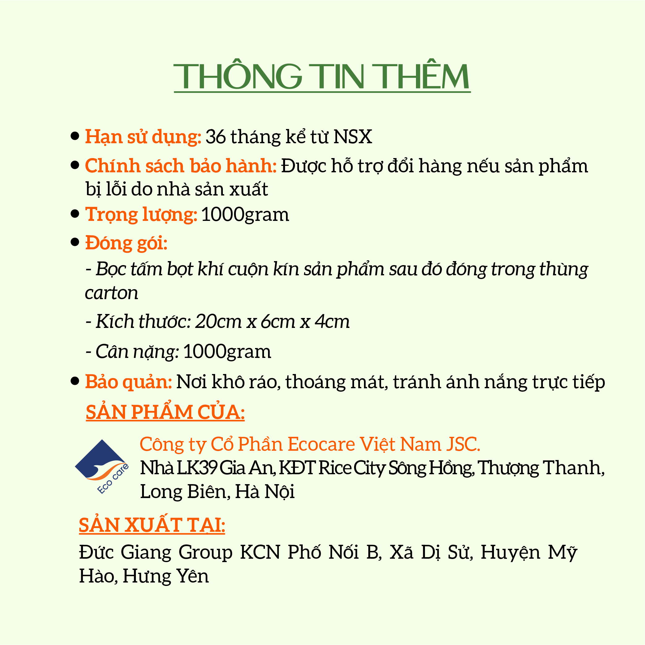 • Sản phẩm Ecocare cam kết: + 0% Hương liệu + 0% Chất tạo màu + 0% Chất hoá học độc hại